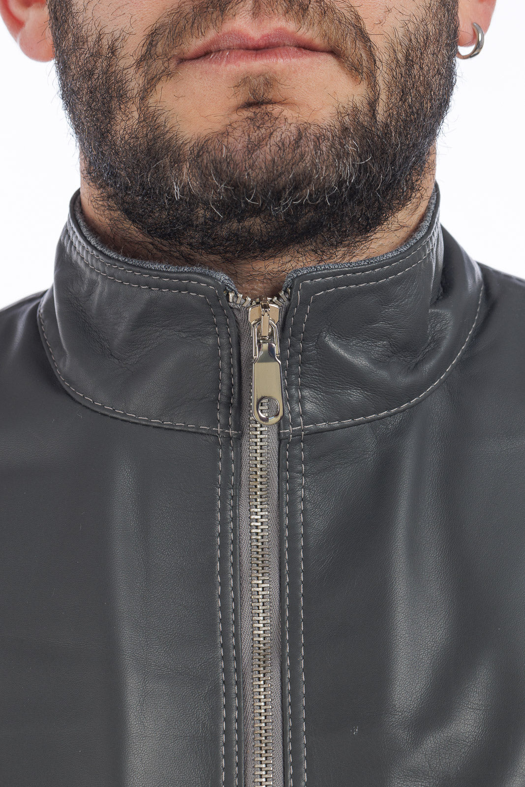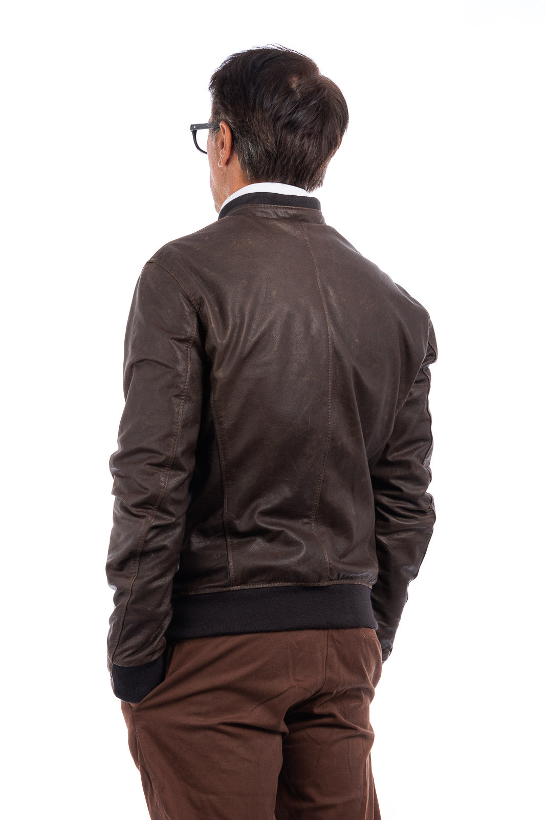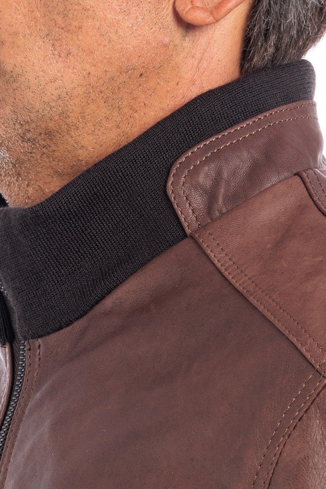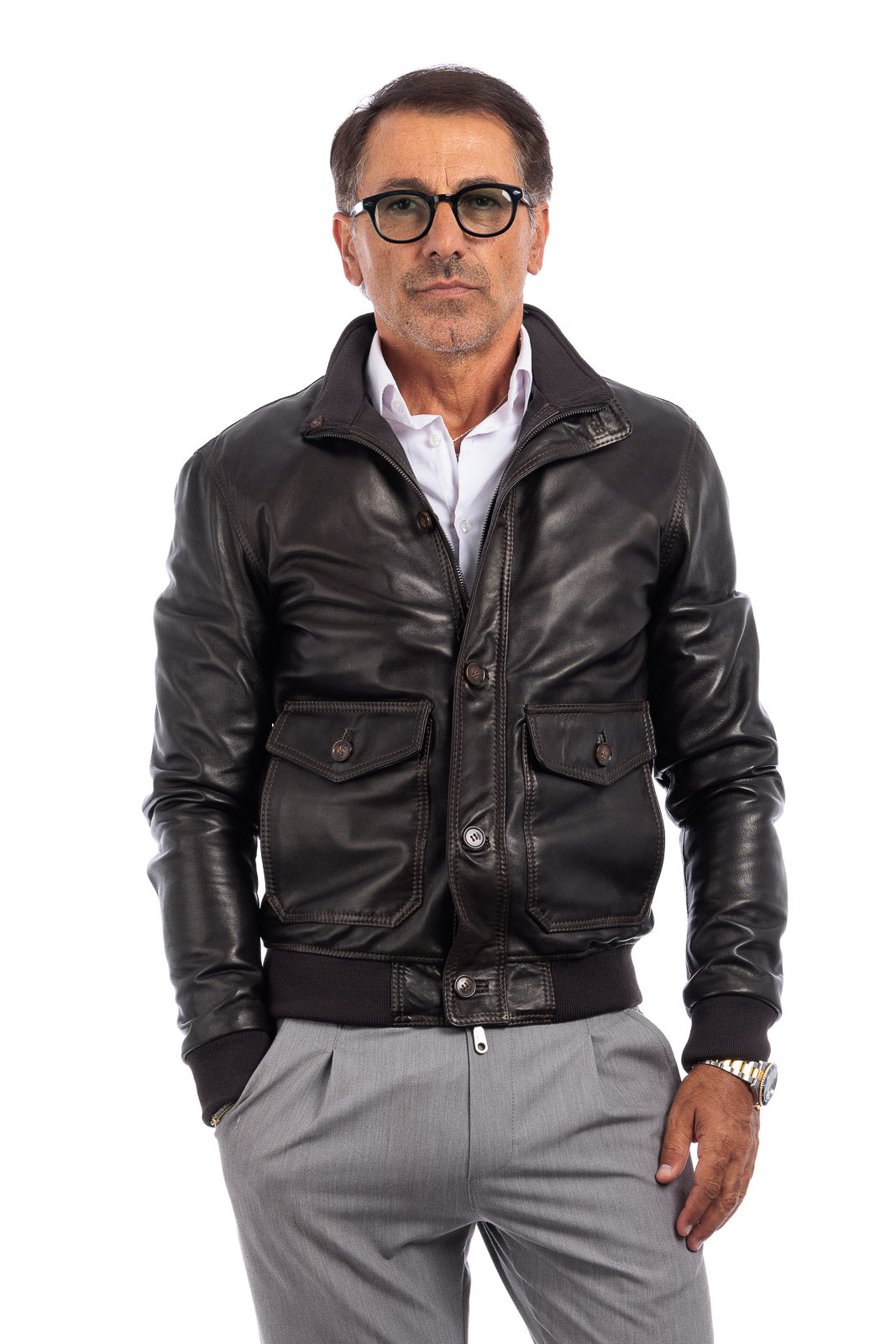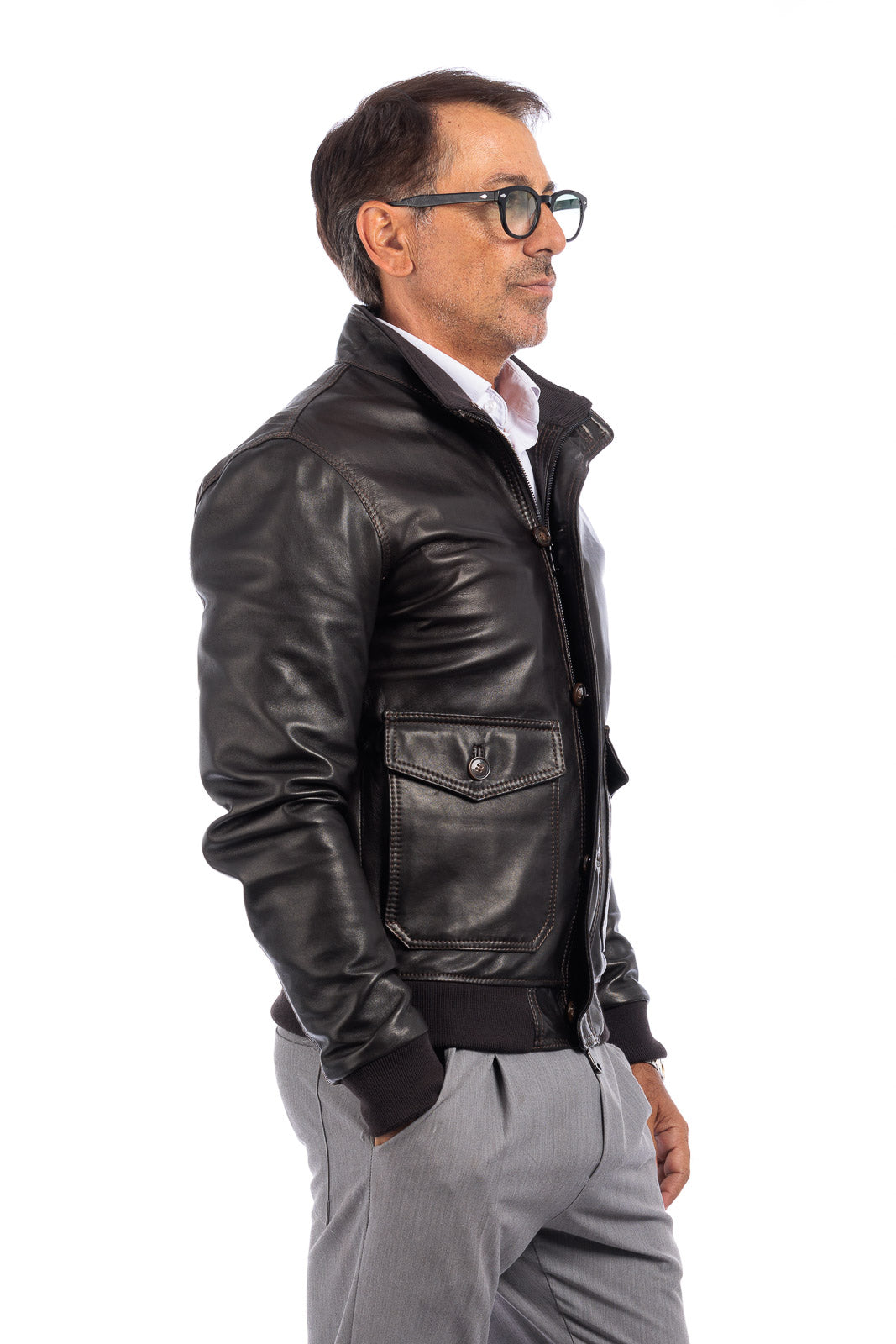 Bomber in pelle uomo con bottoni e zip VAST elasticizzato testa di moro