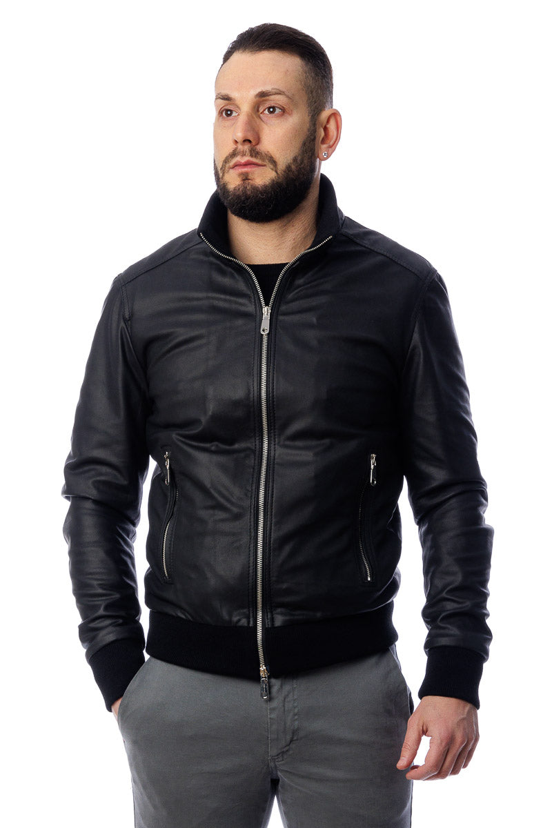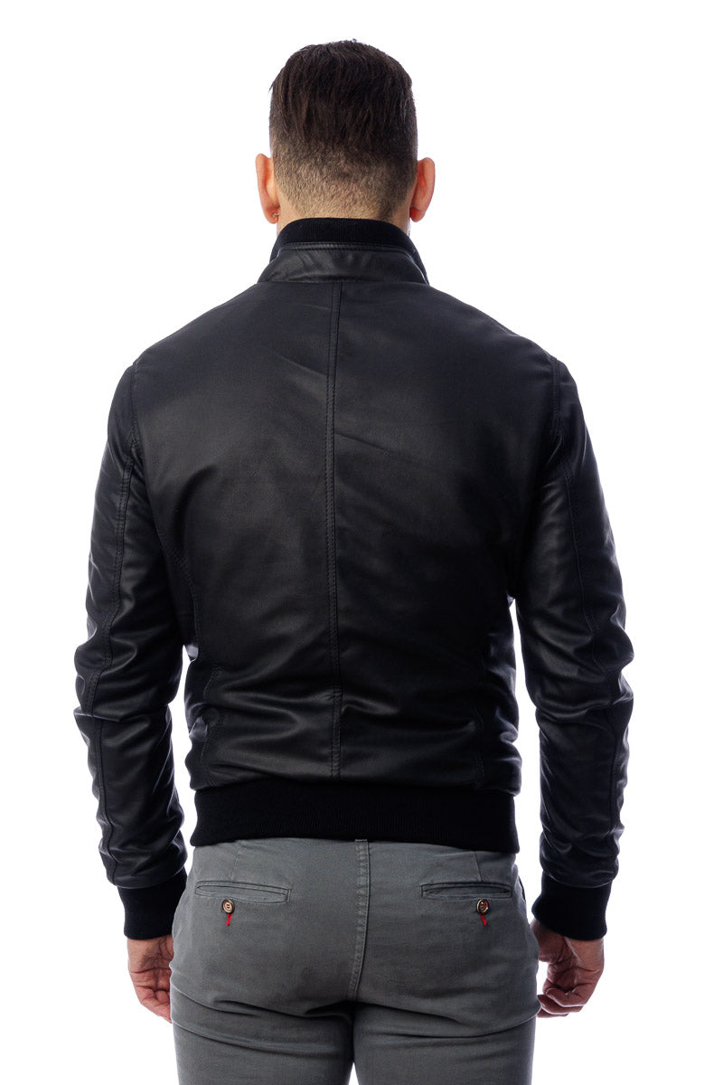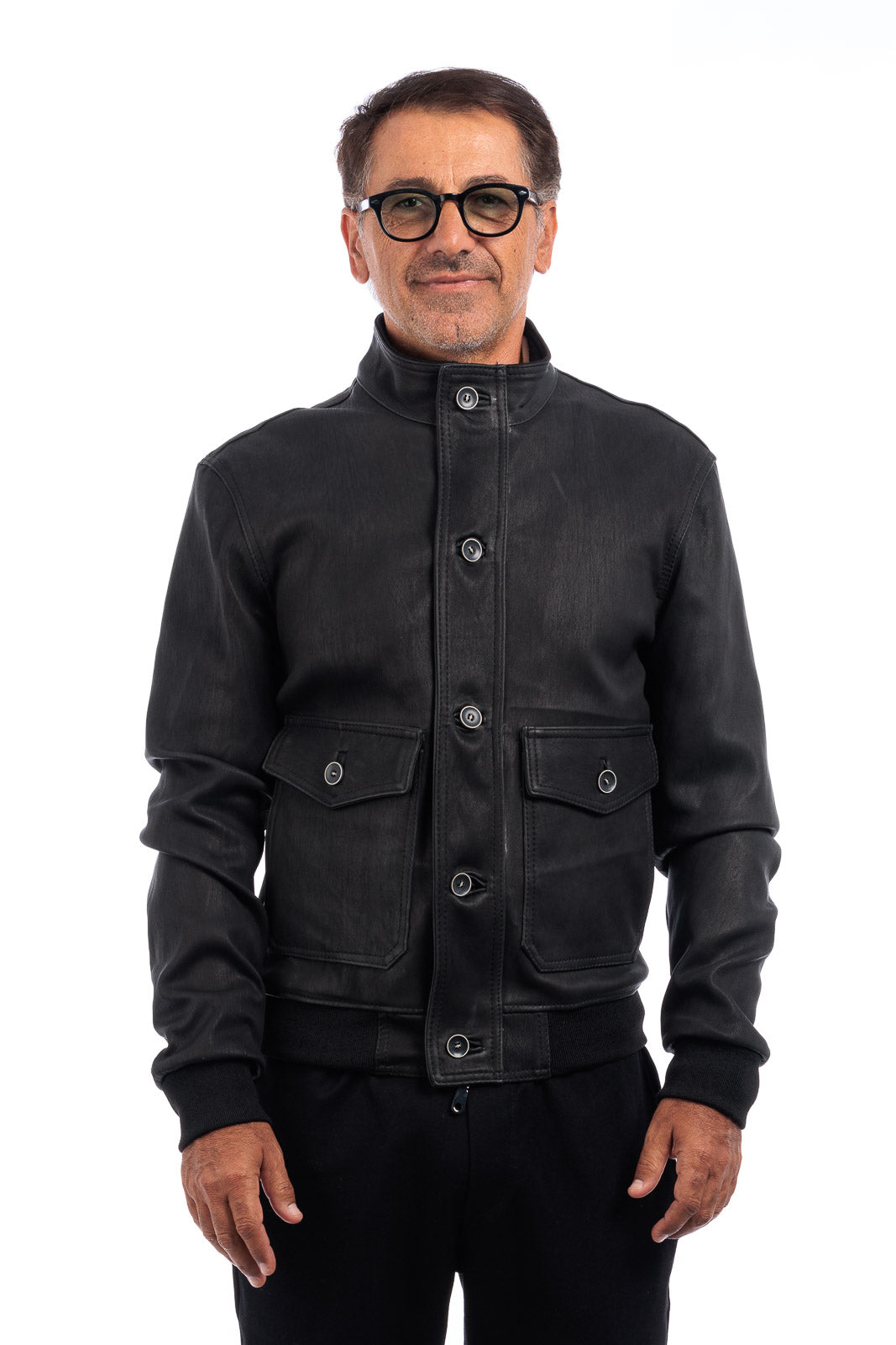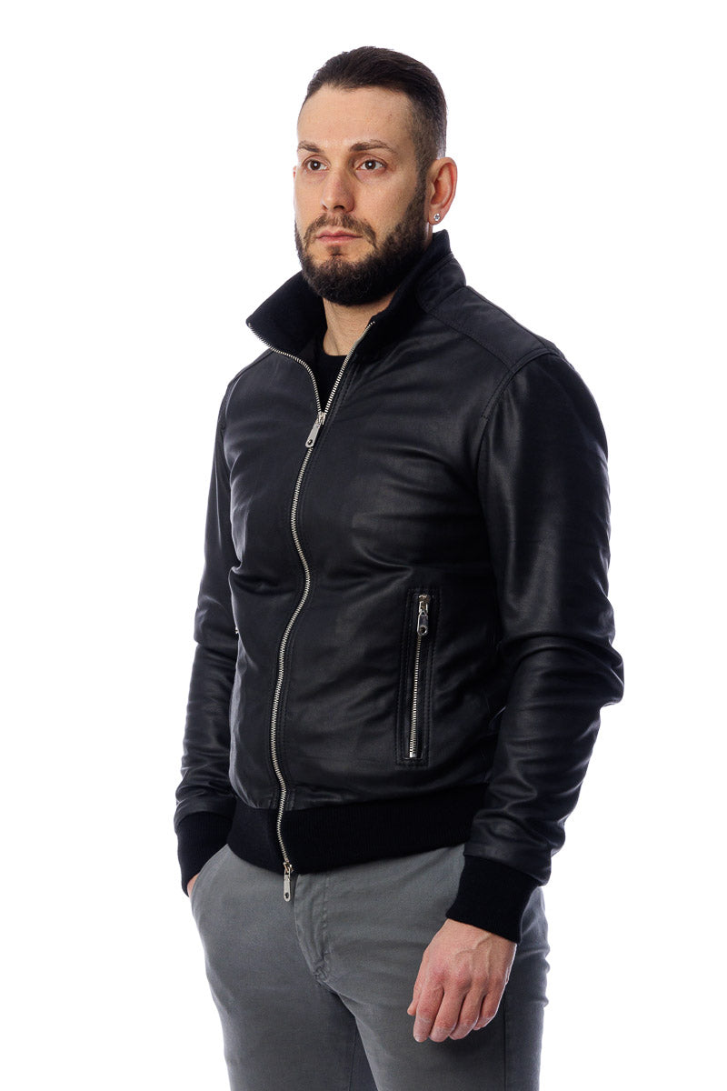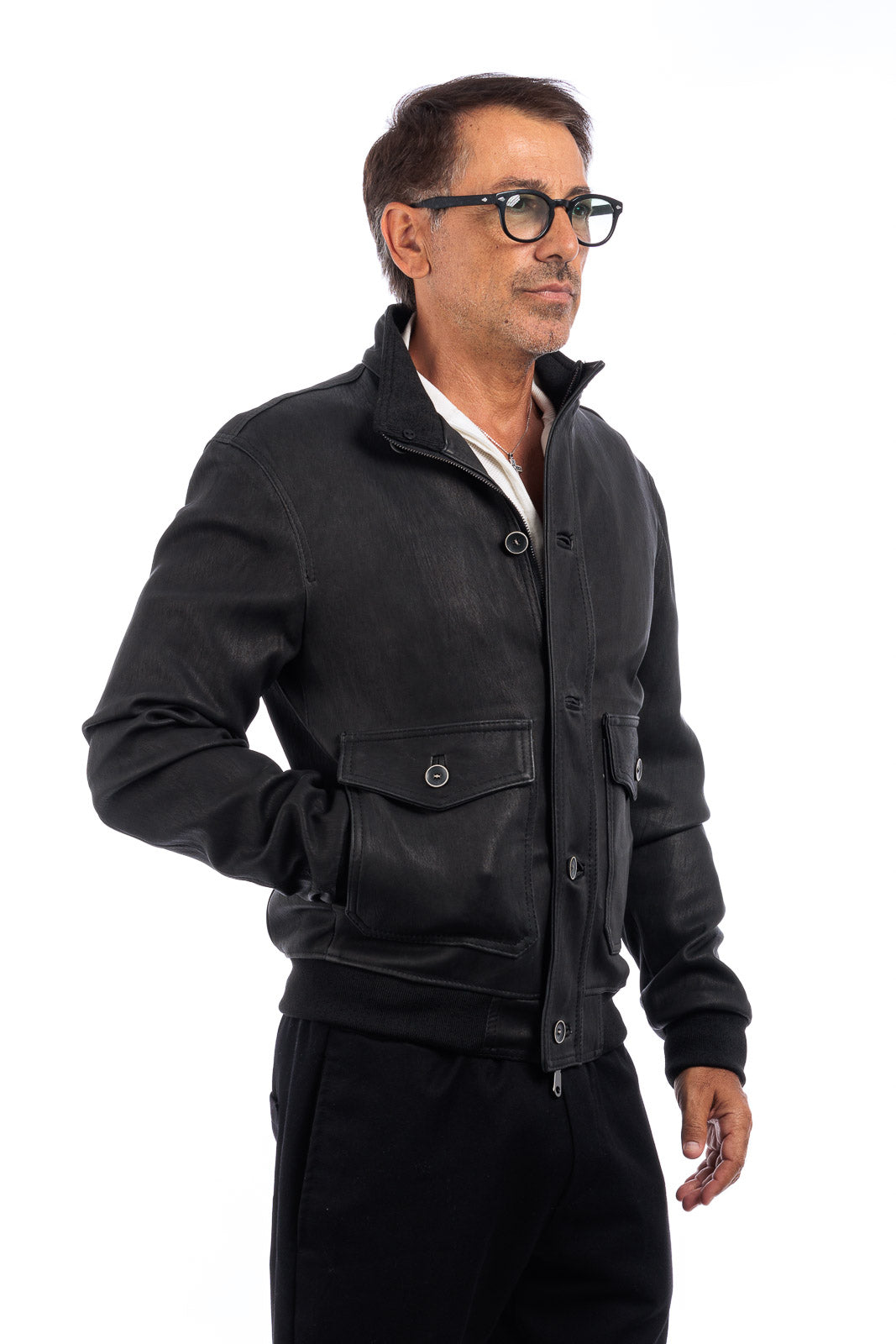Bomber in pelle uomo con bottoni e zip VAST elasticizzato nero