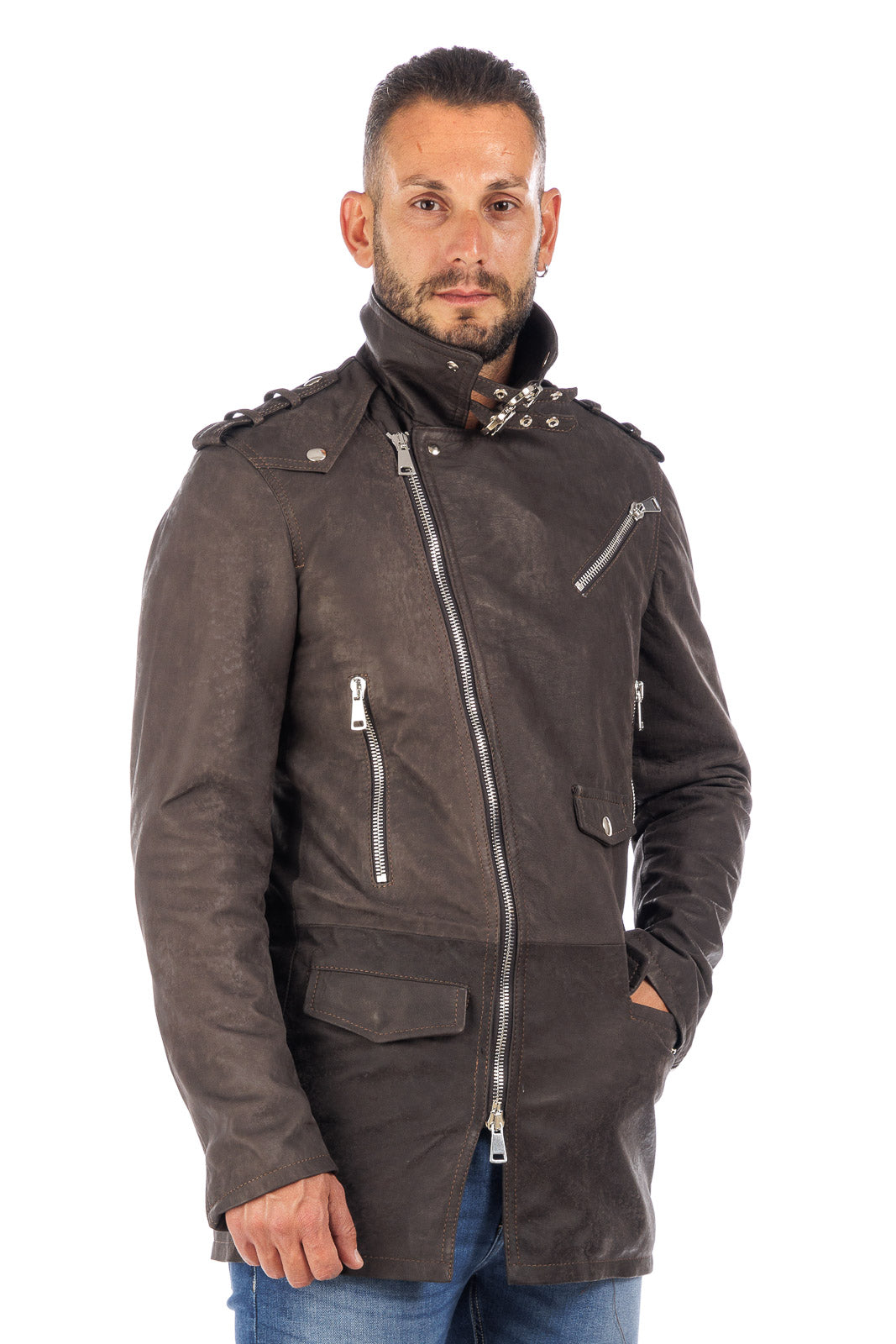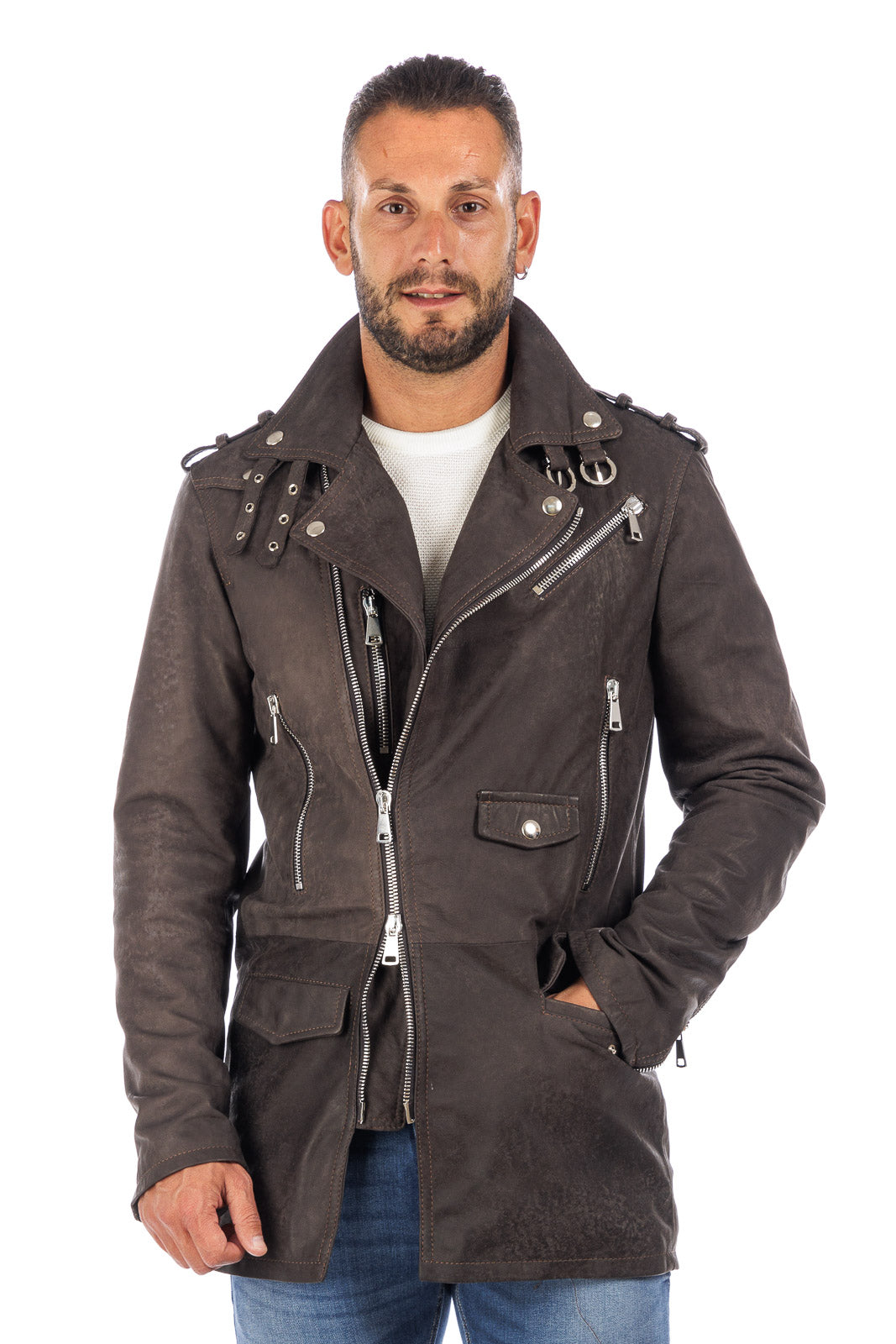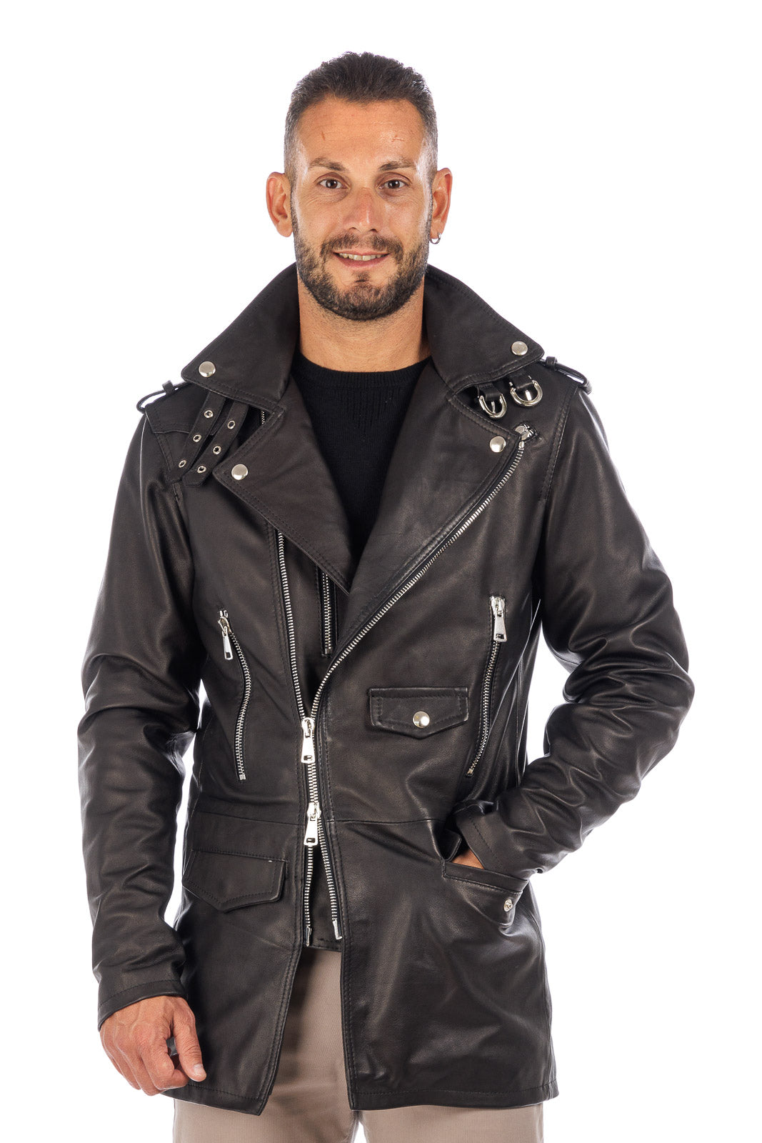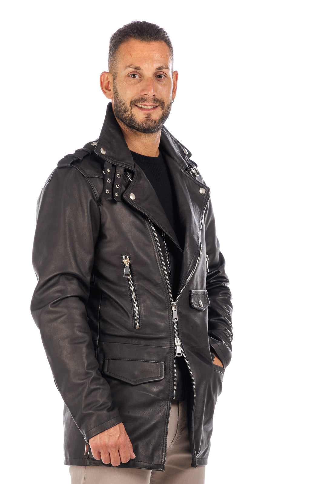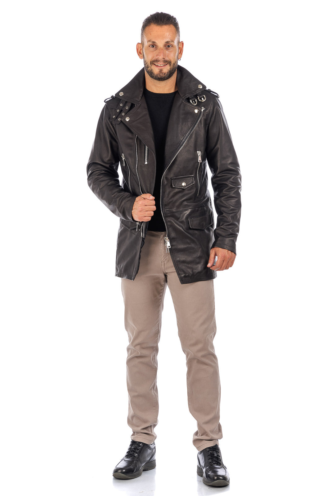 Cappottino chiodo in vera pelle uomo con zip testa di moro