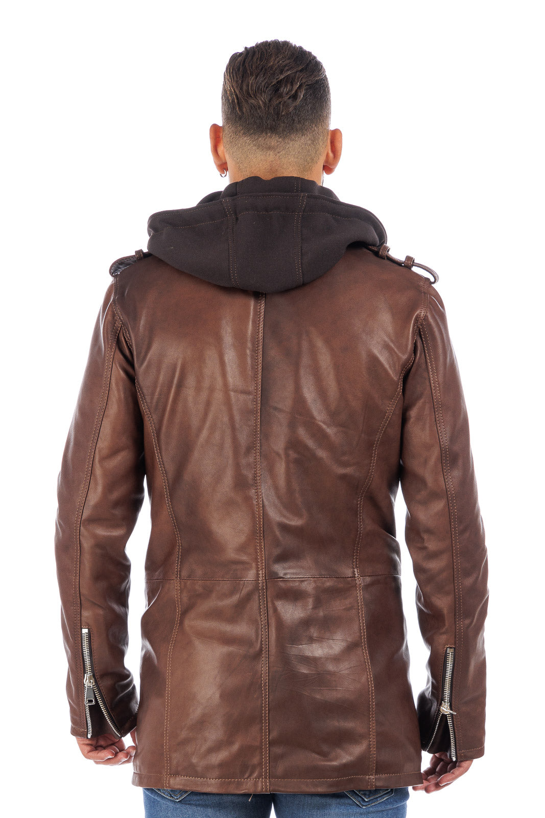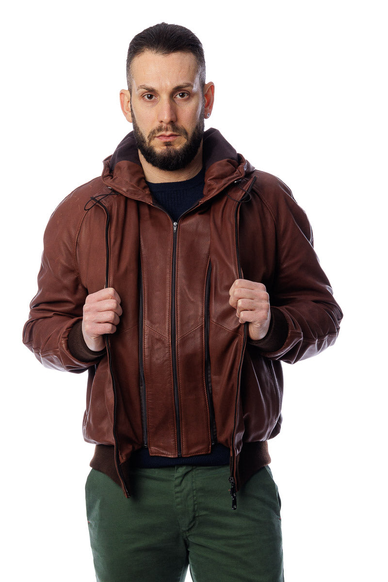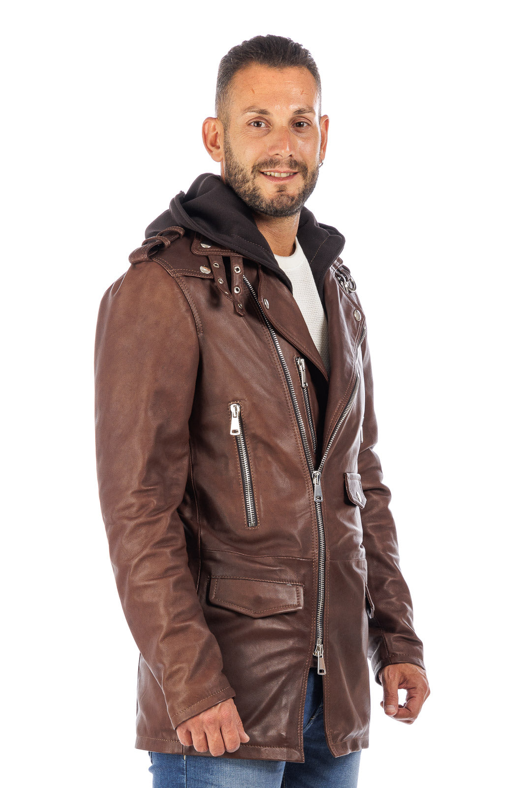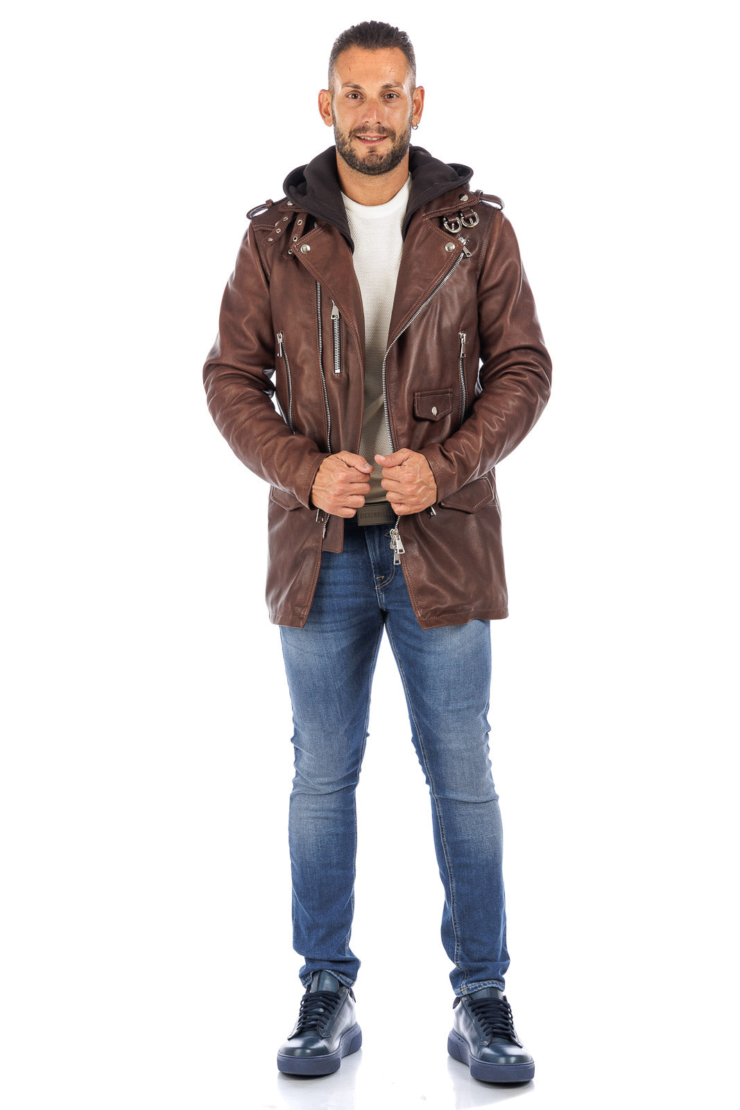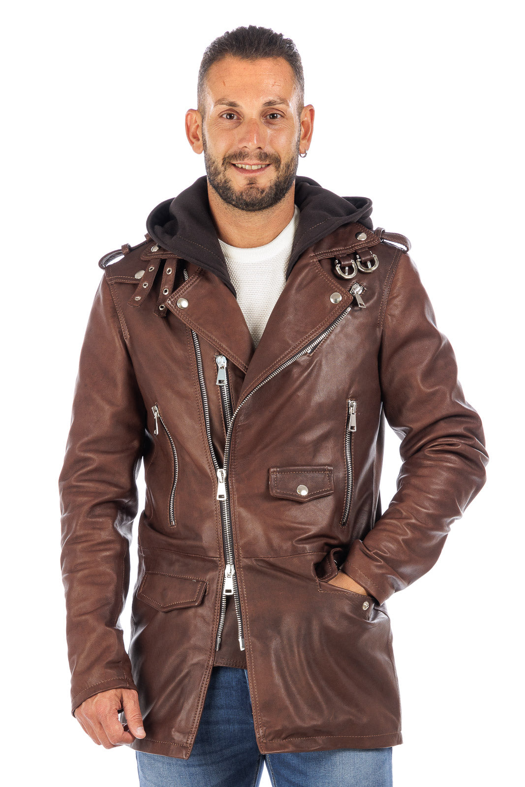 Cappottino chiodo in vera pelle uomo con zip marrone