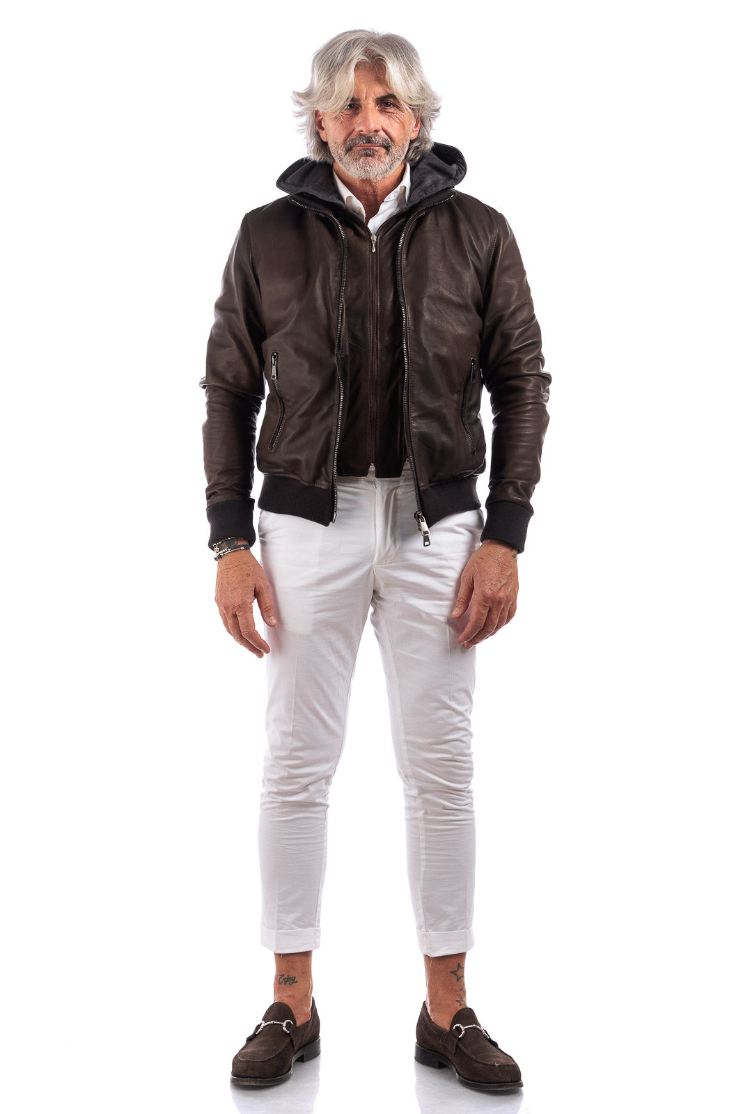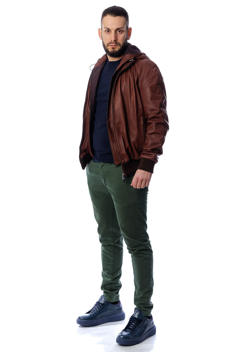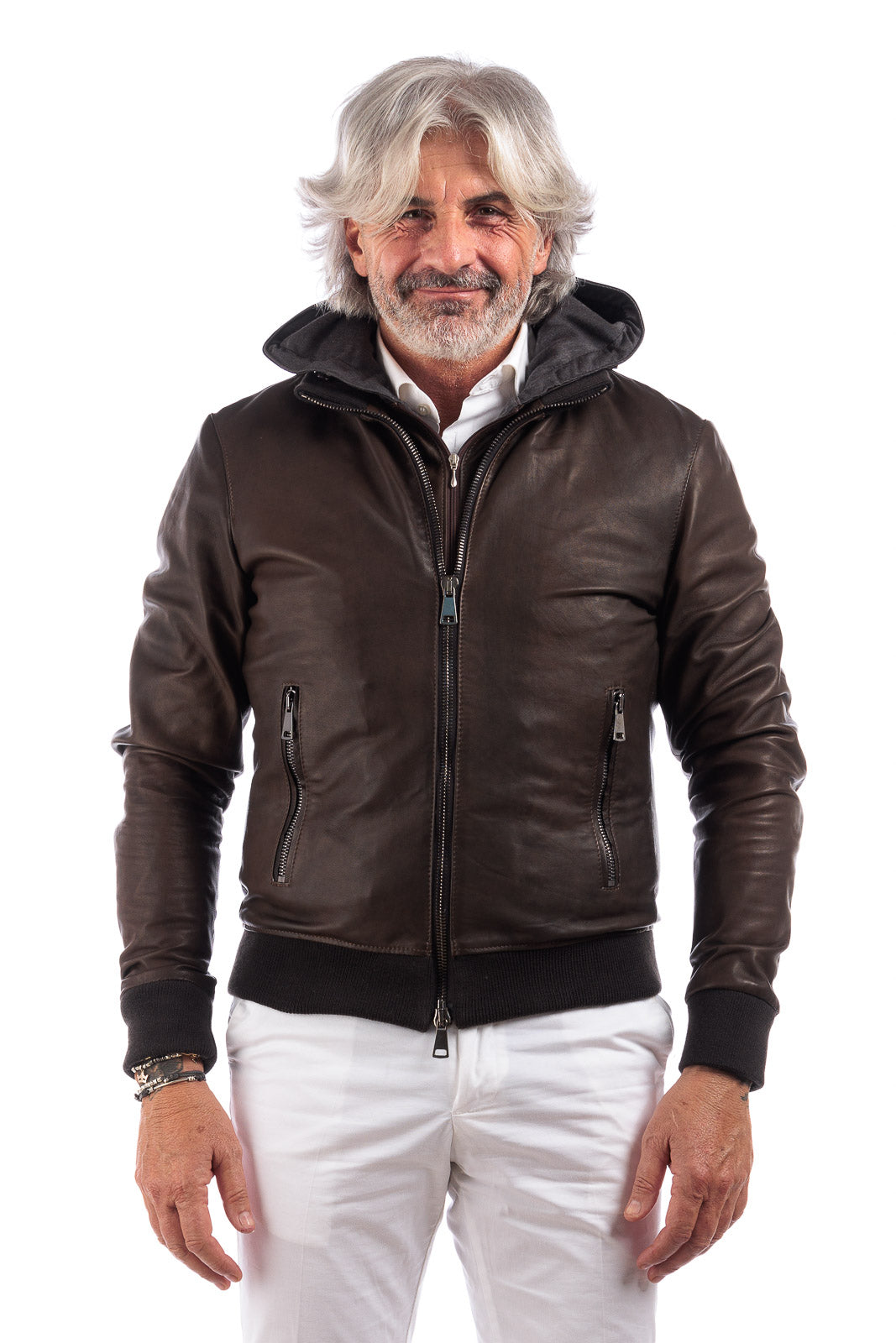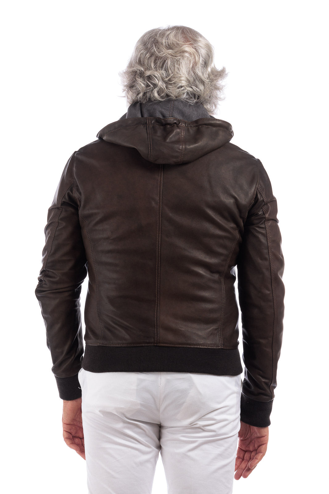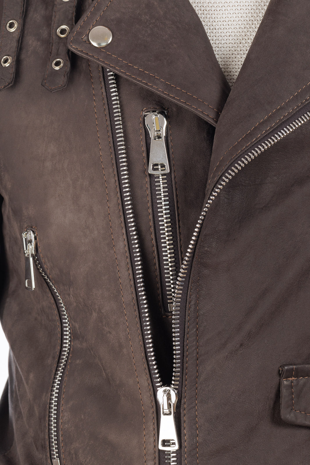 Cappottino chiodo in vera pelle uomo con zip marrone