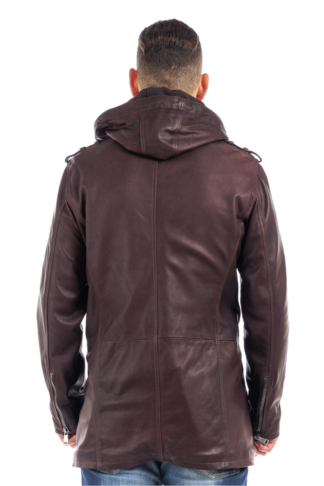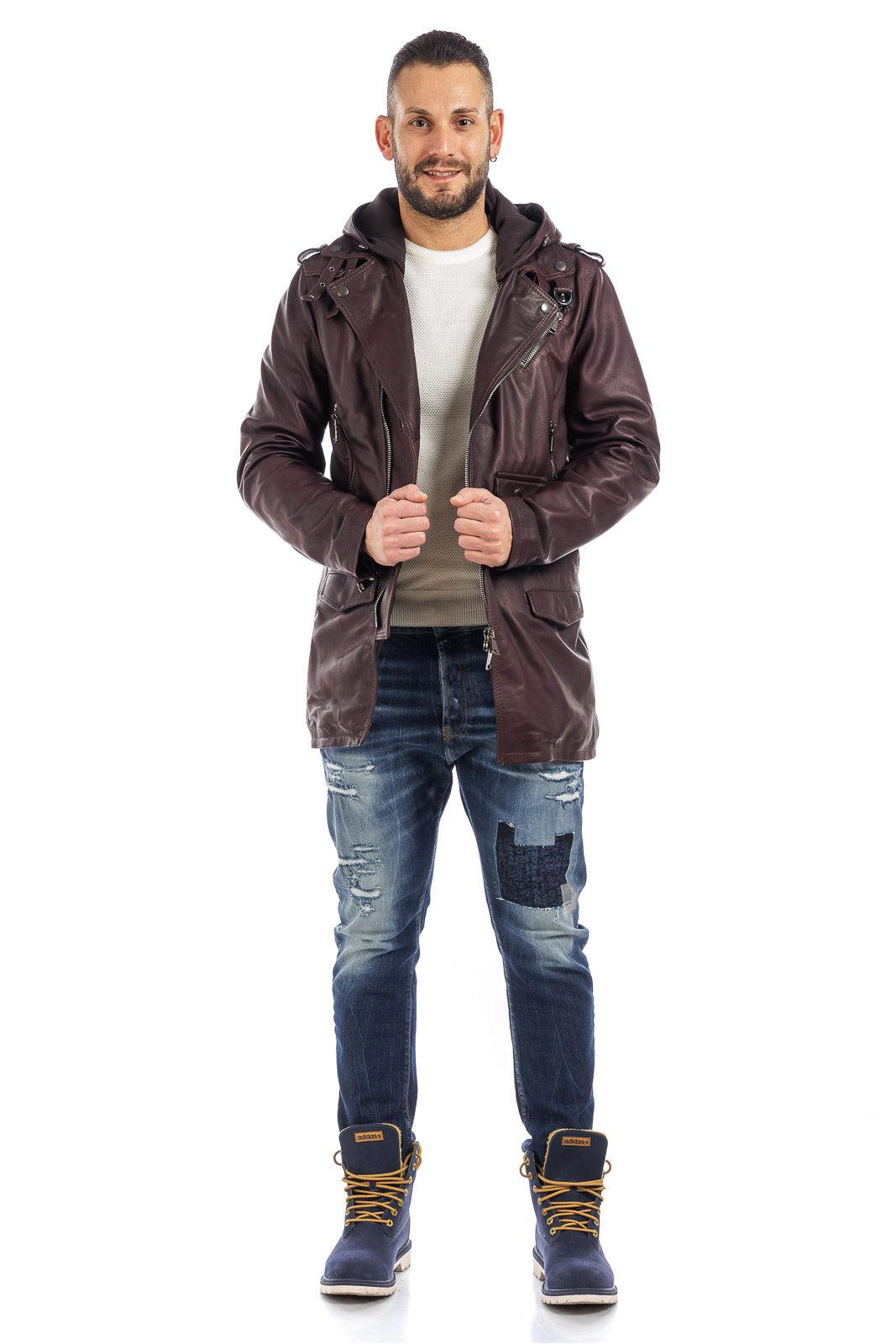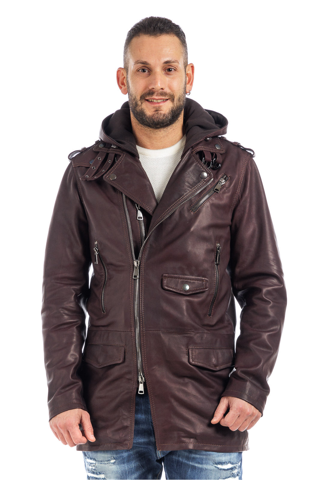 Cappottino chiodo in vera pelle uomo con zip marrone vinaccia