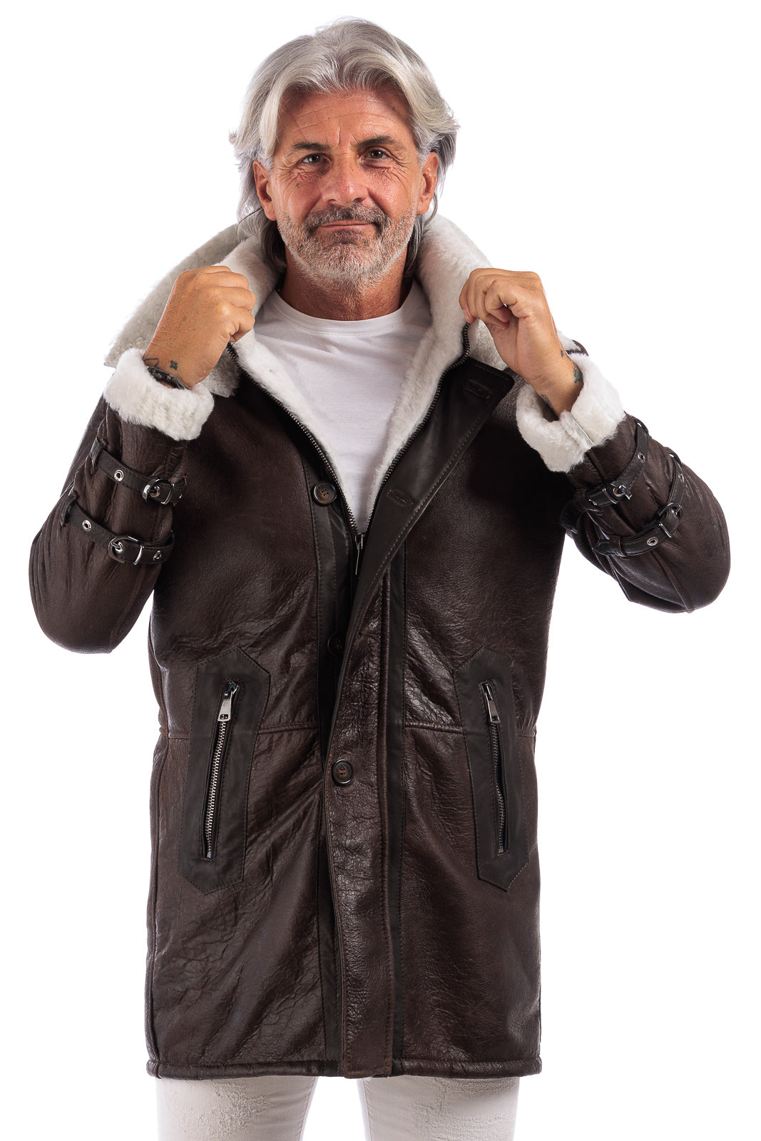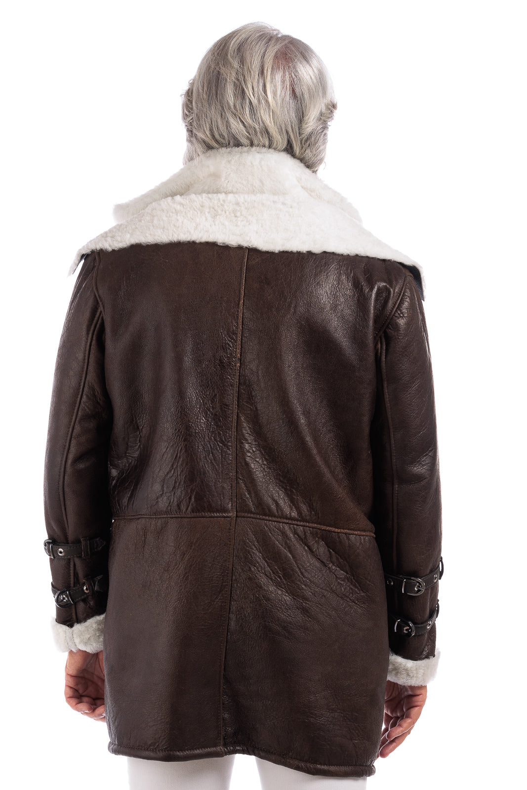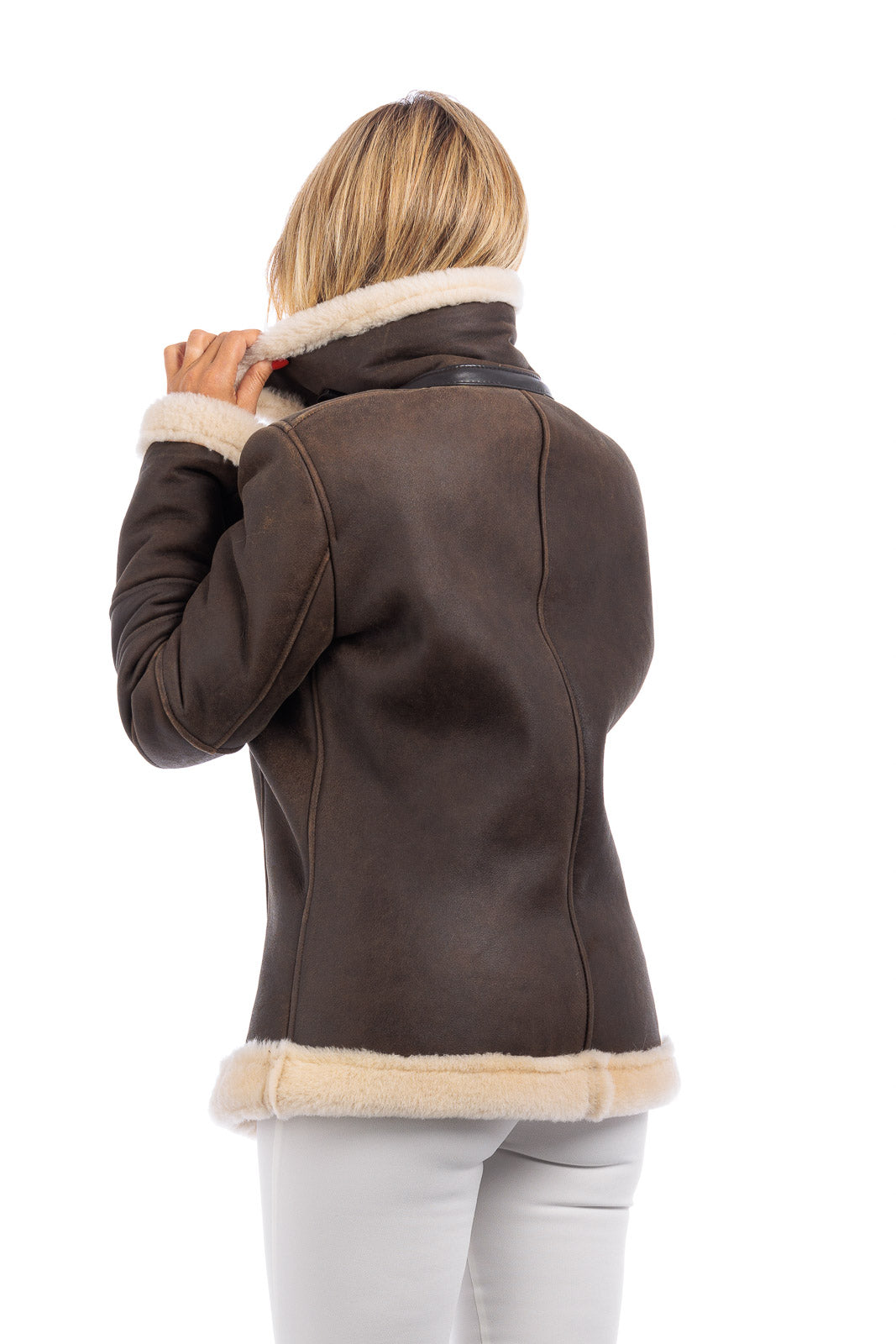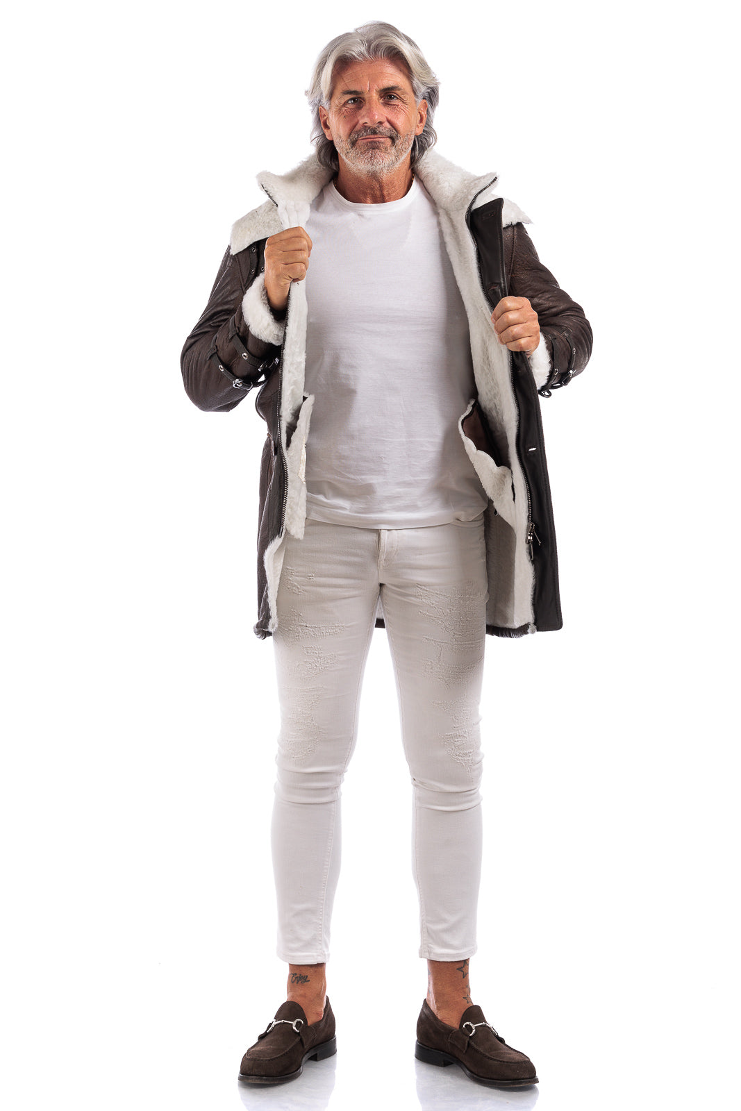 Cappottino in vero montone marrone con pelo bianco e bottoni