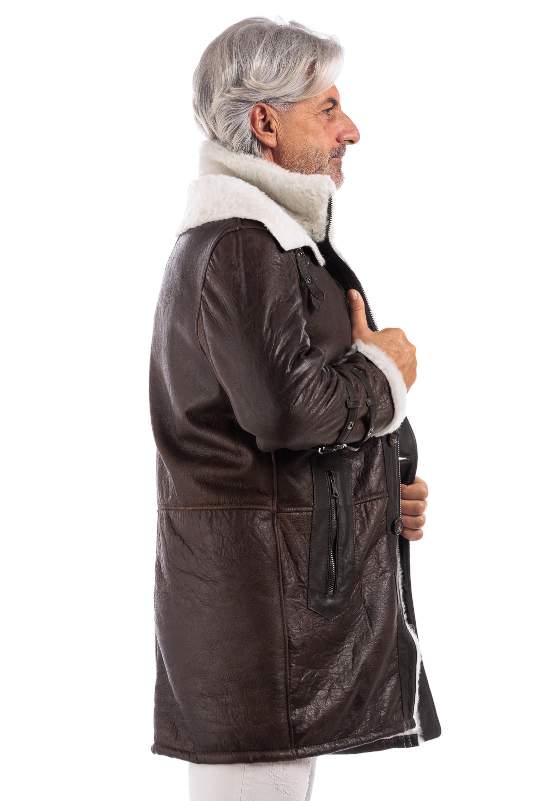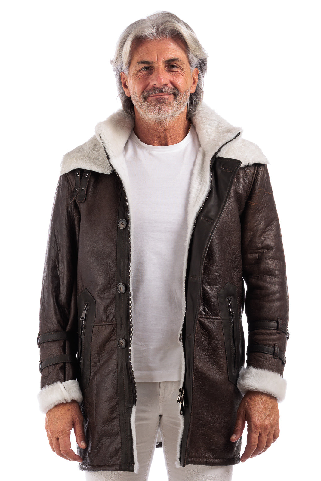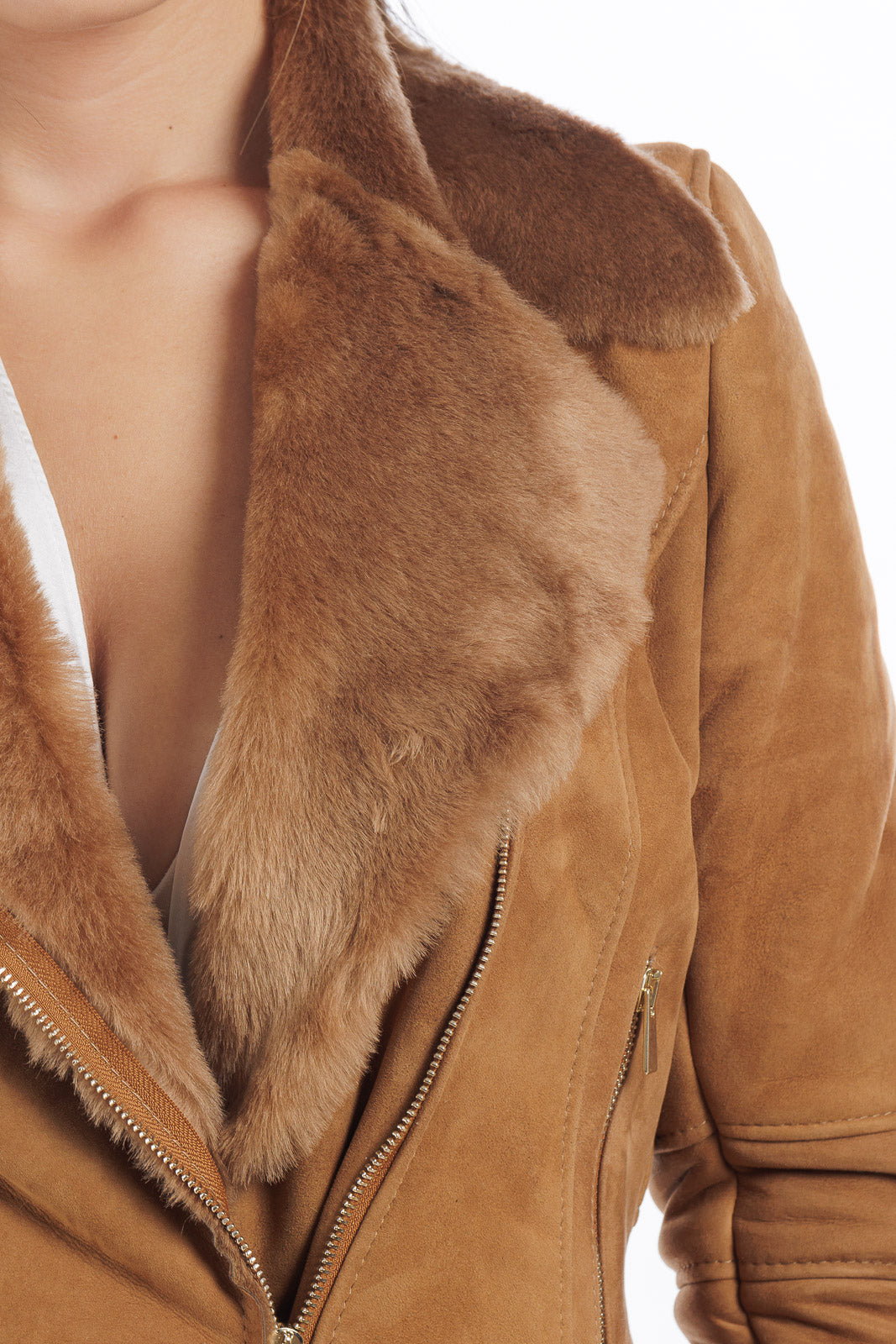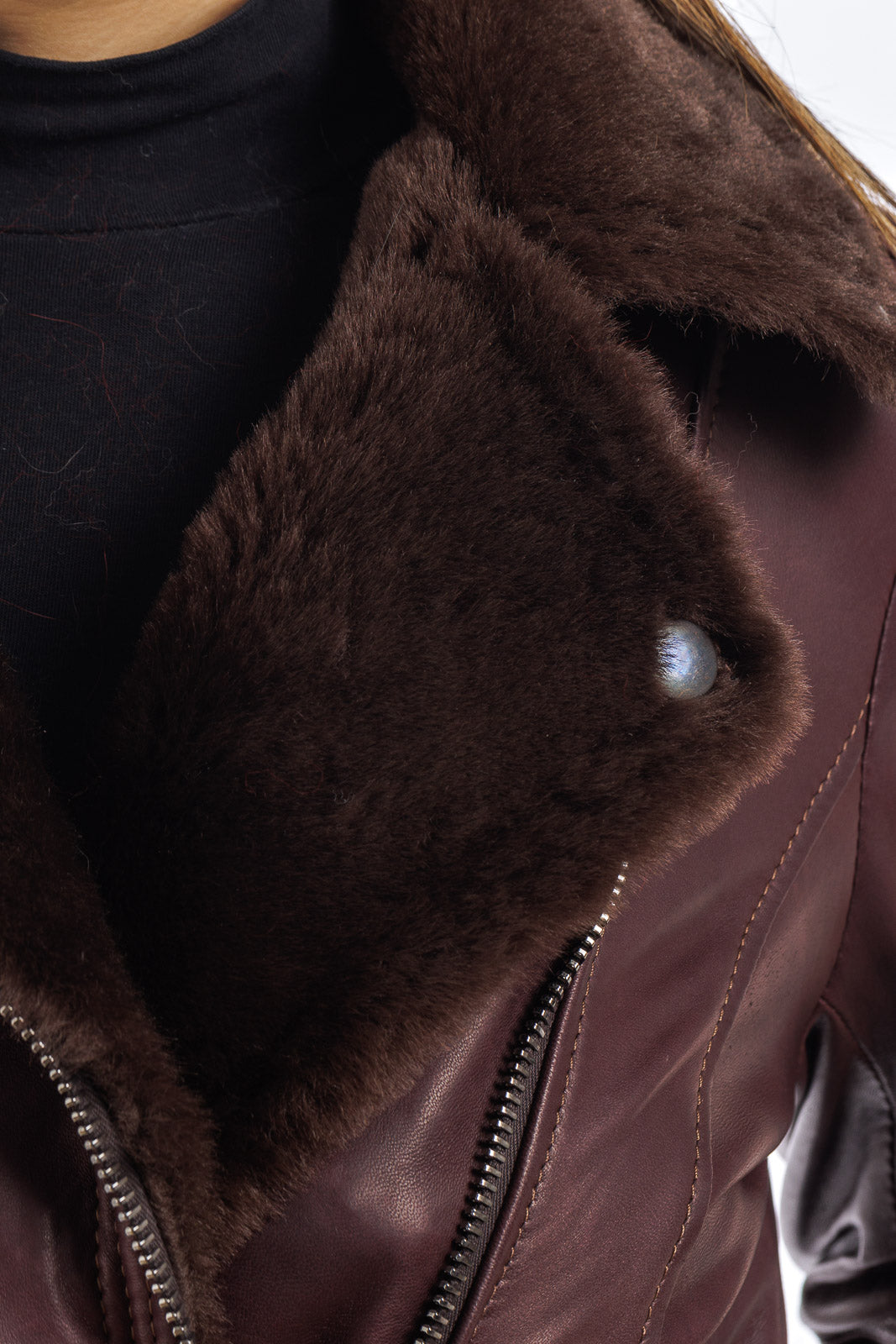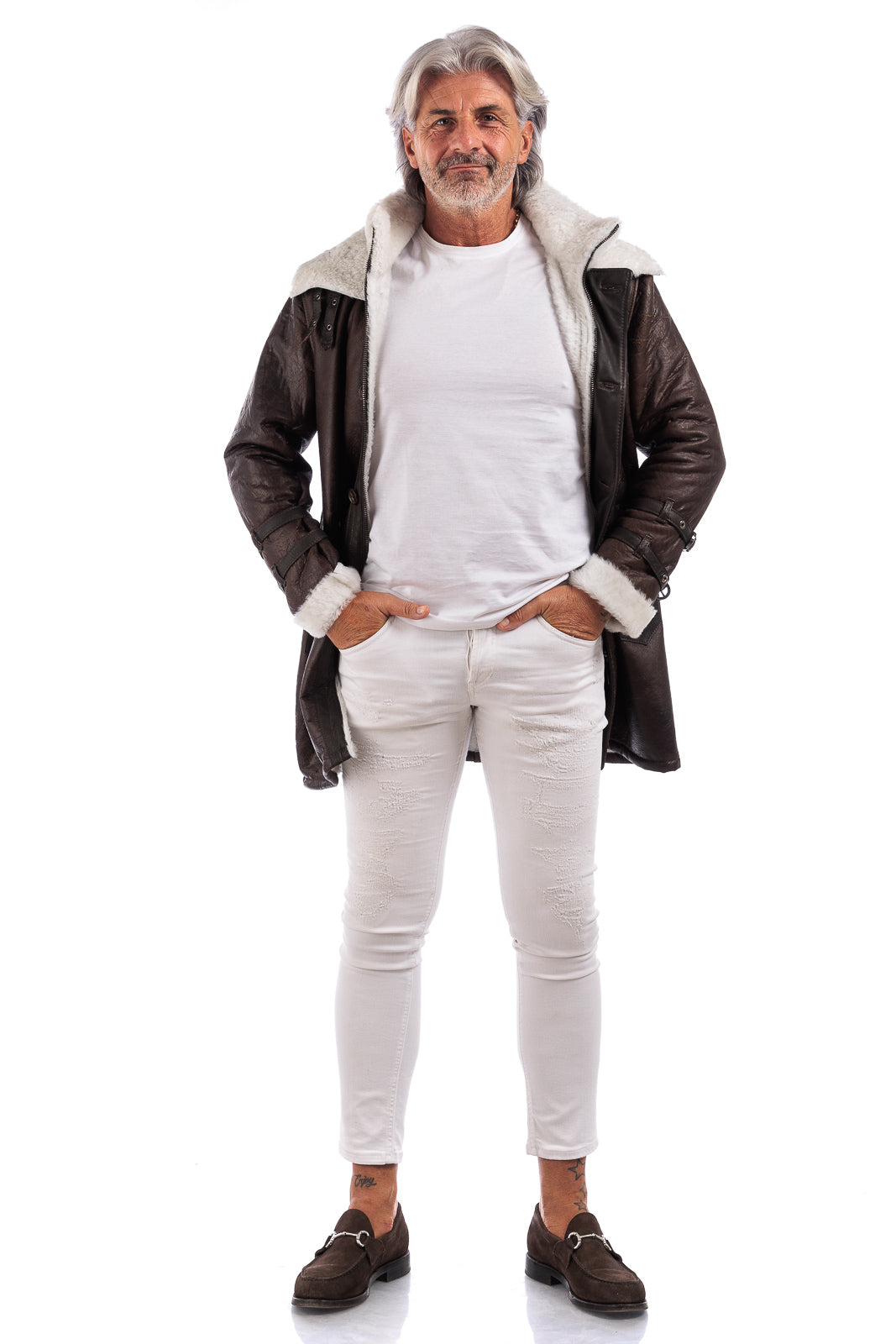 Cappottino in vero montone marrone con pelo bianco e bottoni