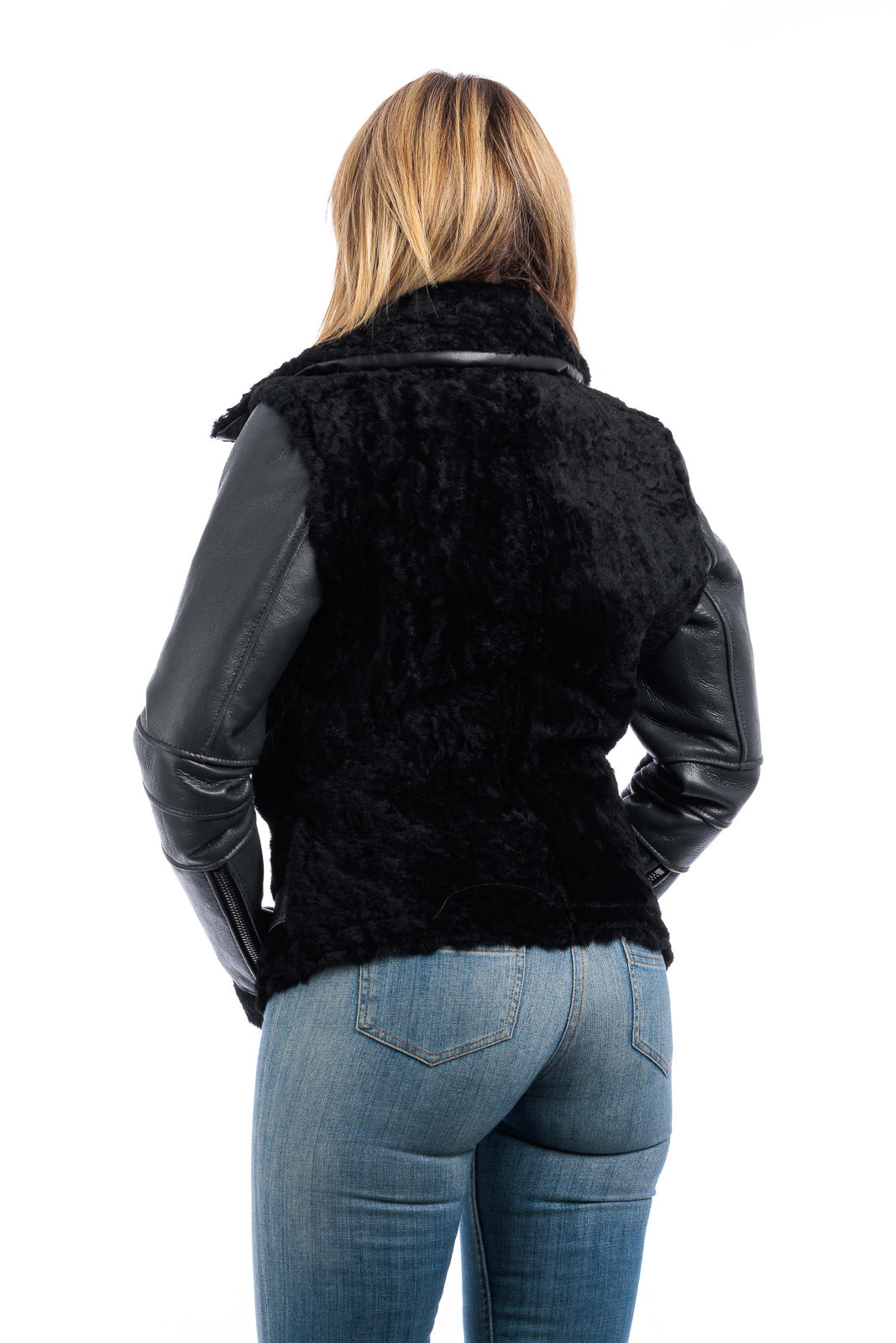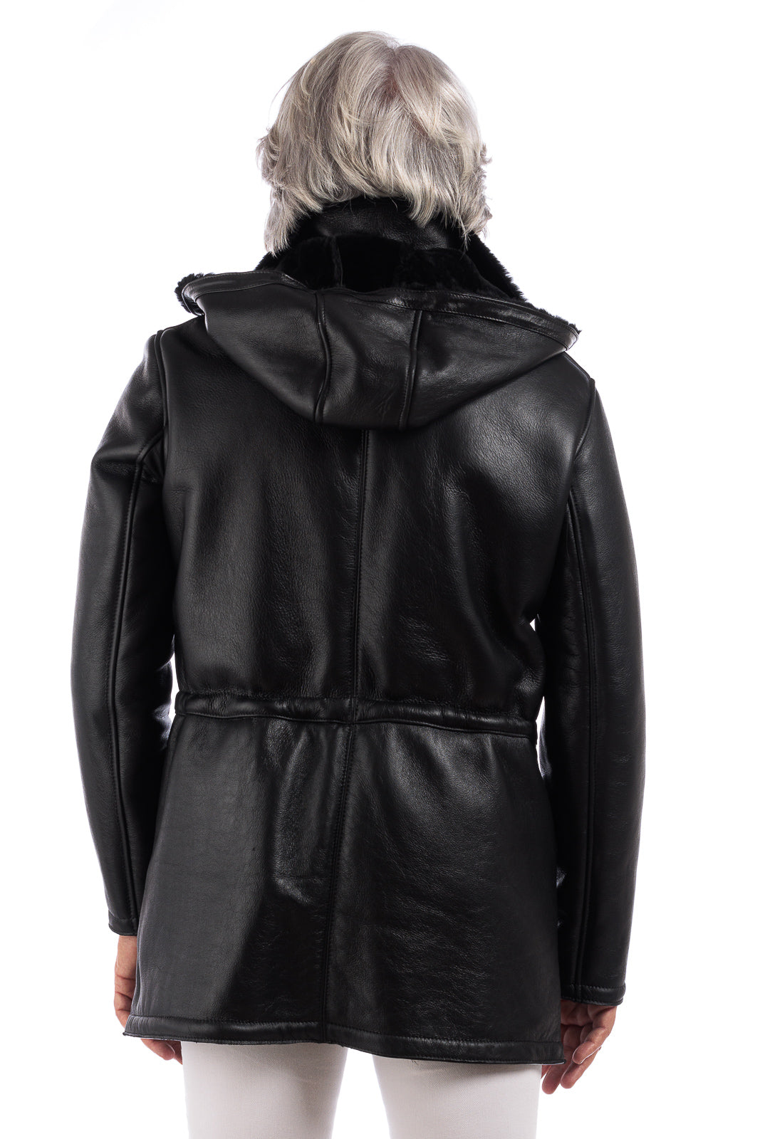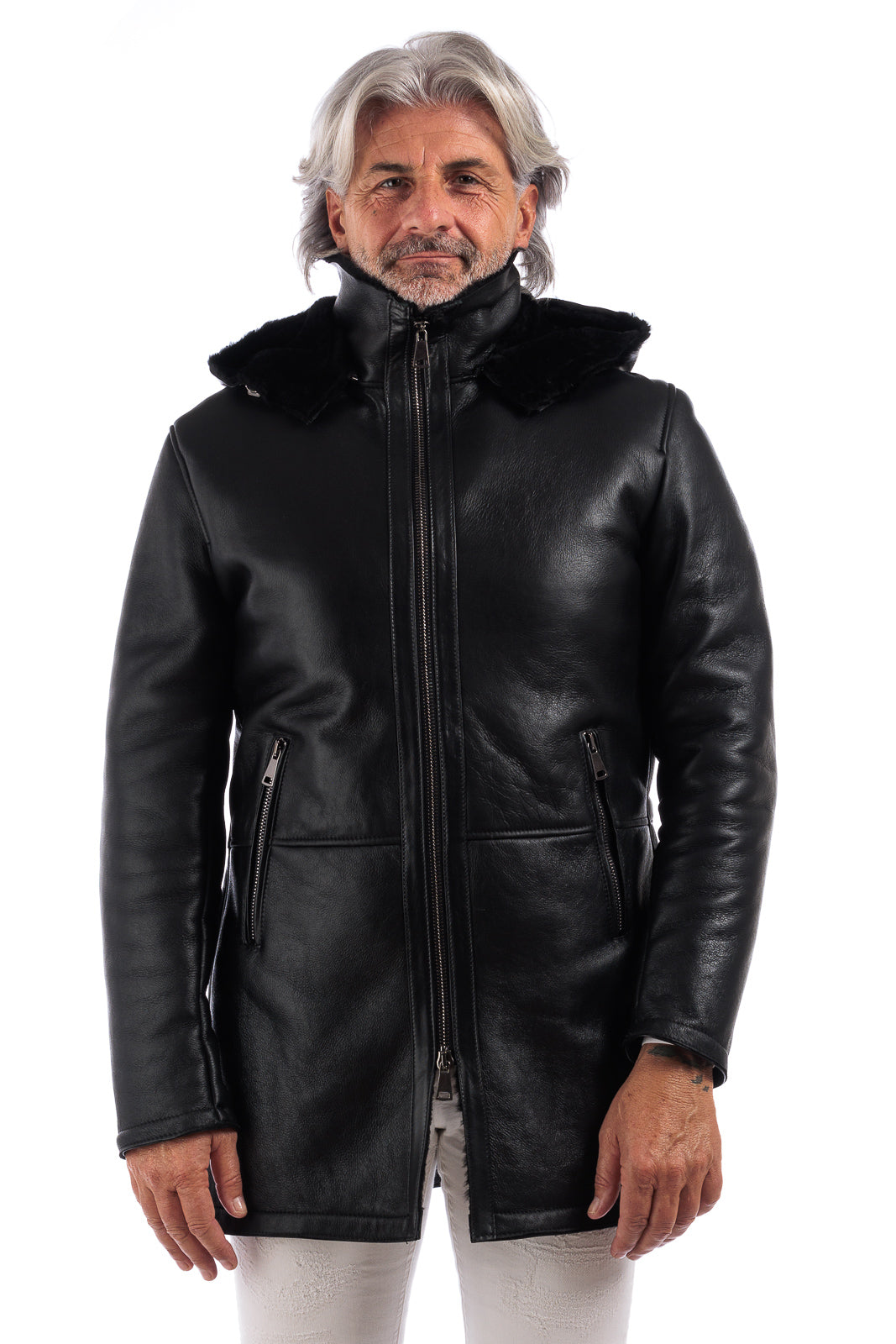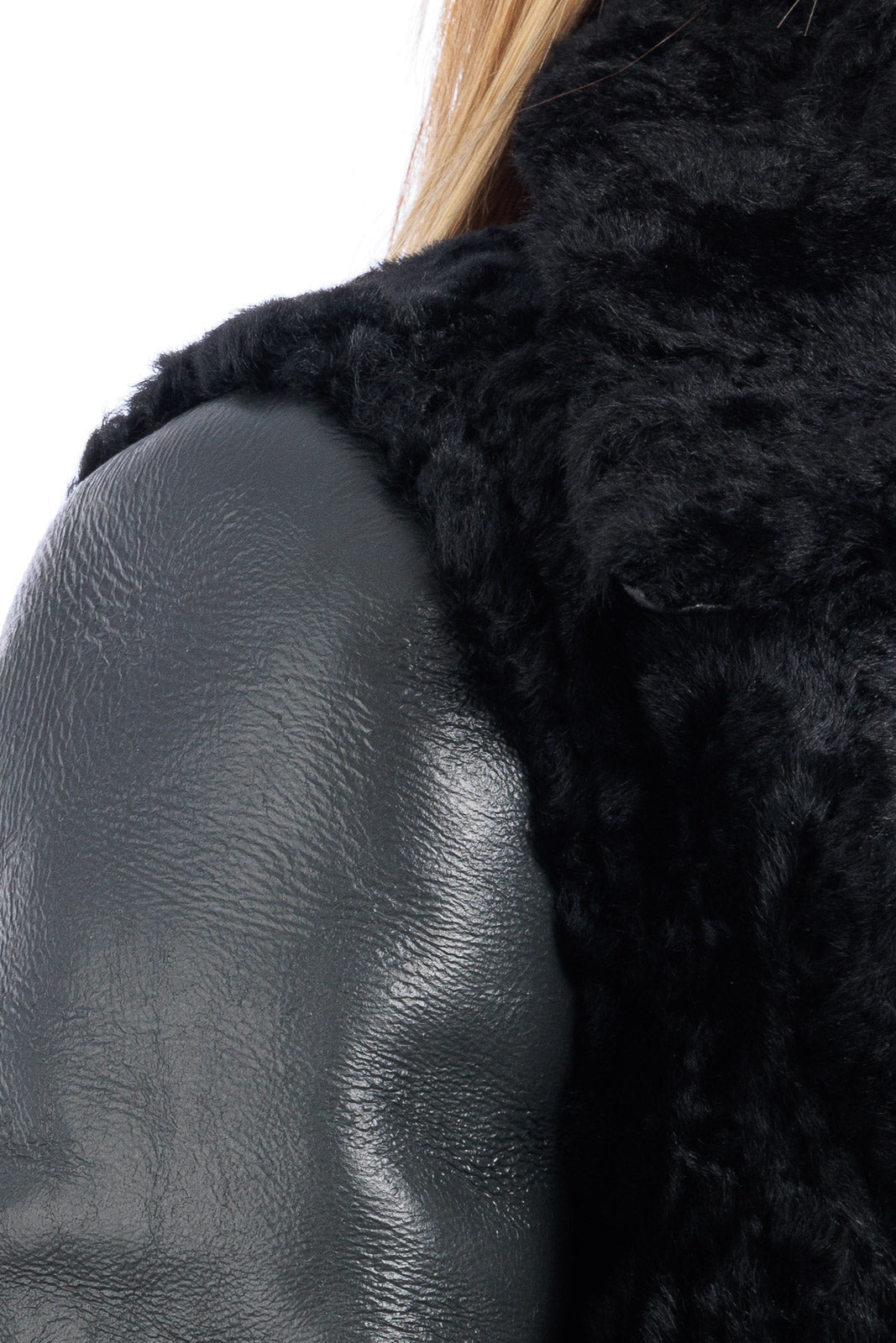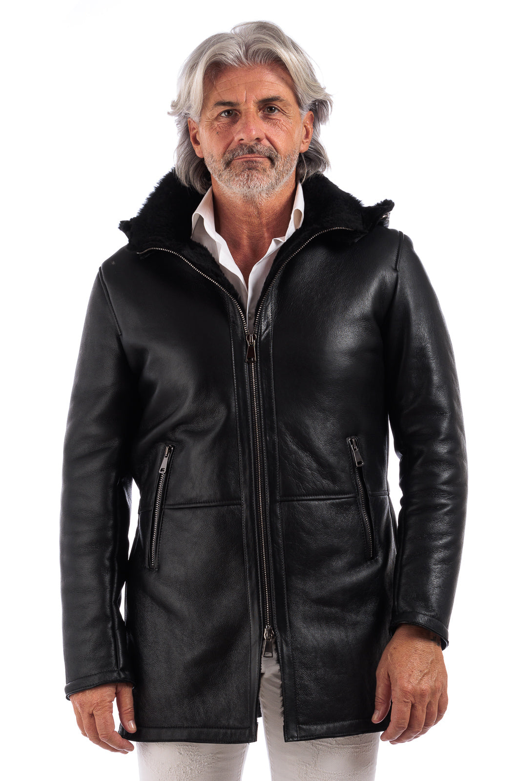 Cappottino in vero montone nero con pelo nero e cappuccio