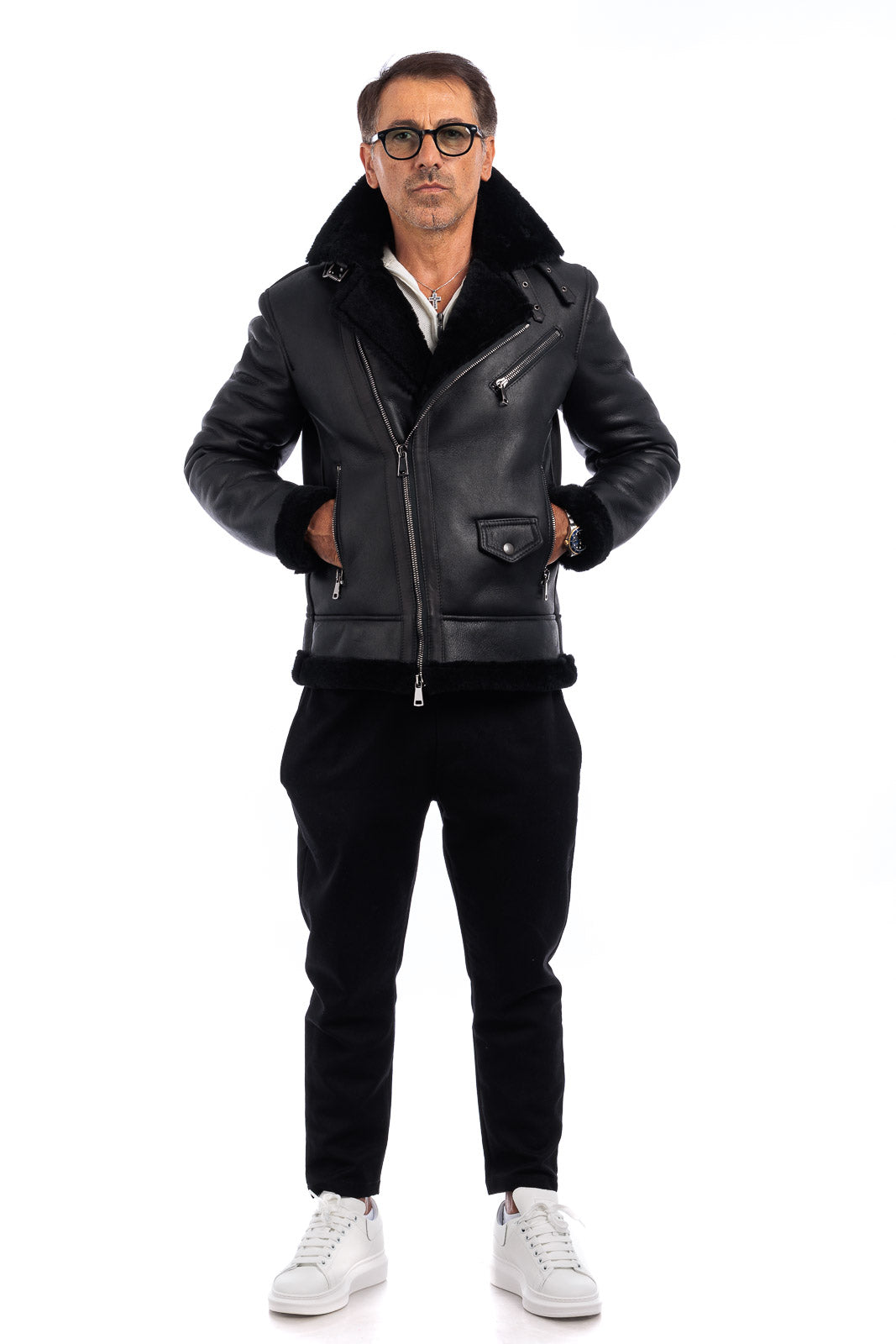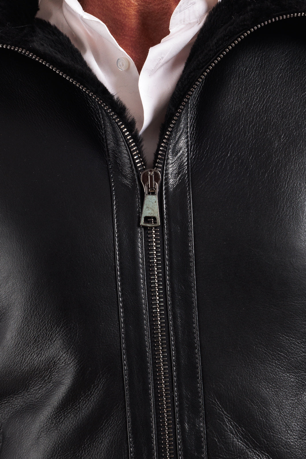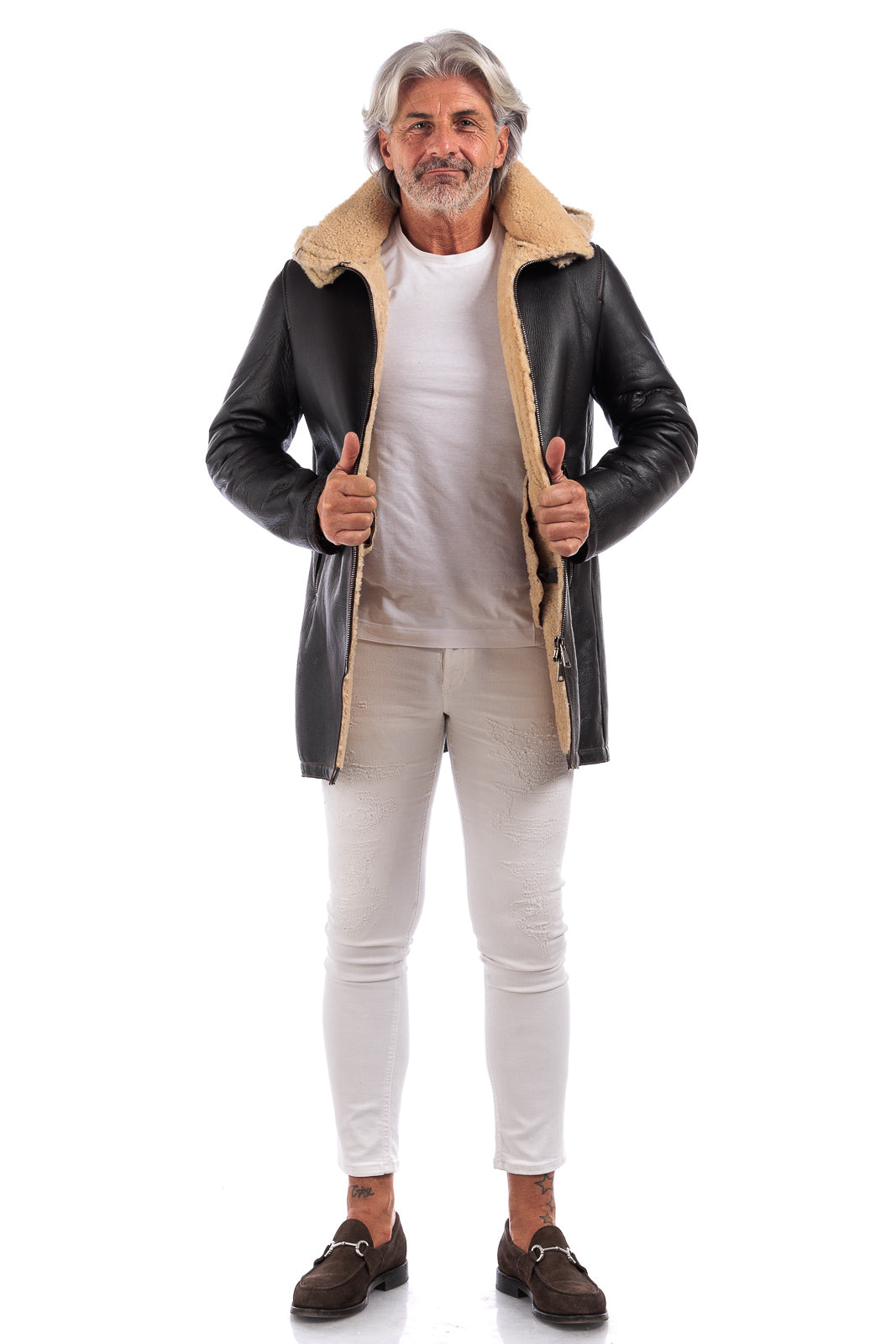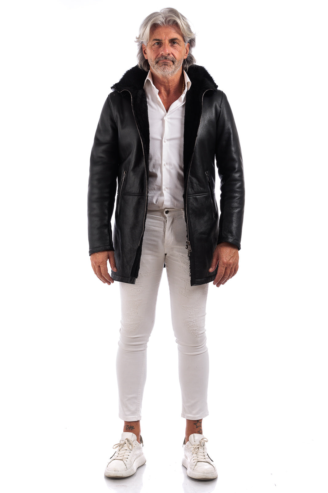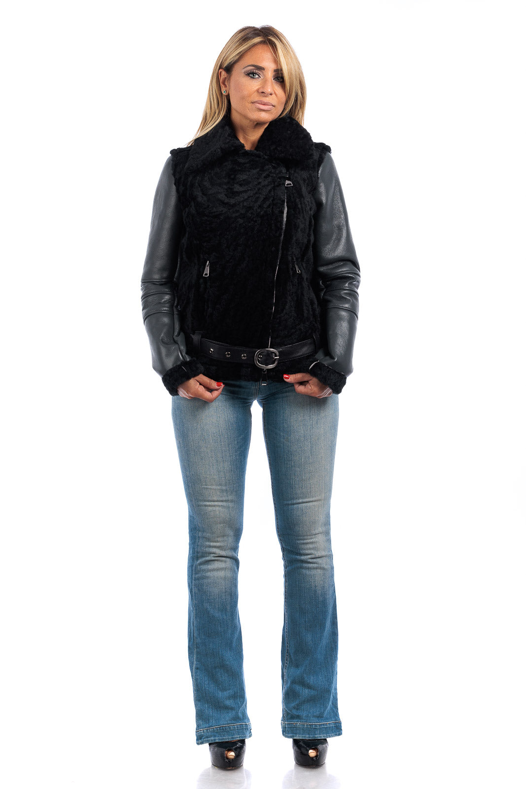 Cappottino in vero montone nero con pelo nero e cappuccio