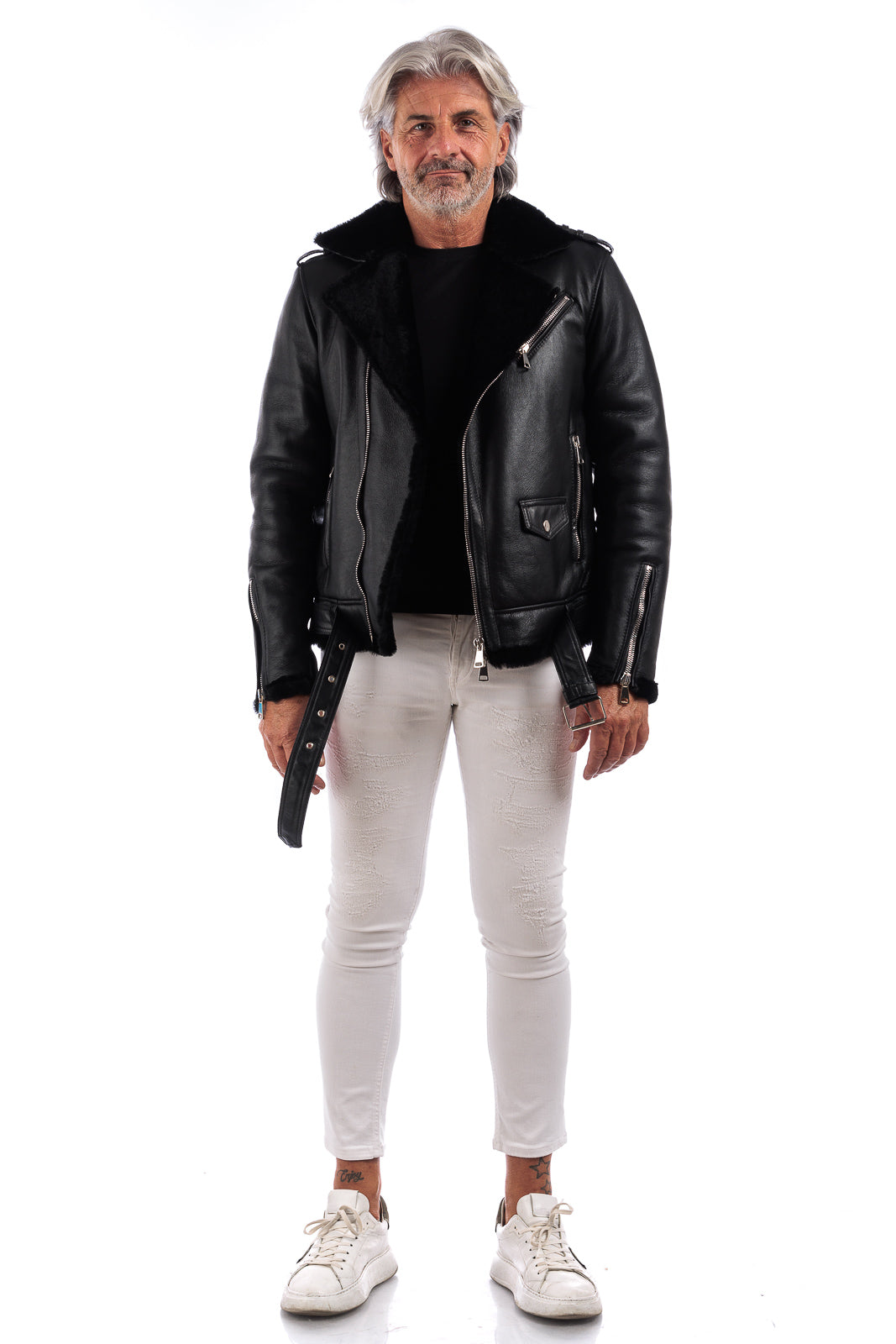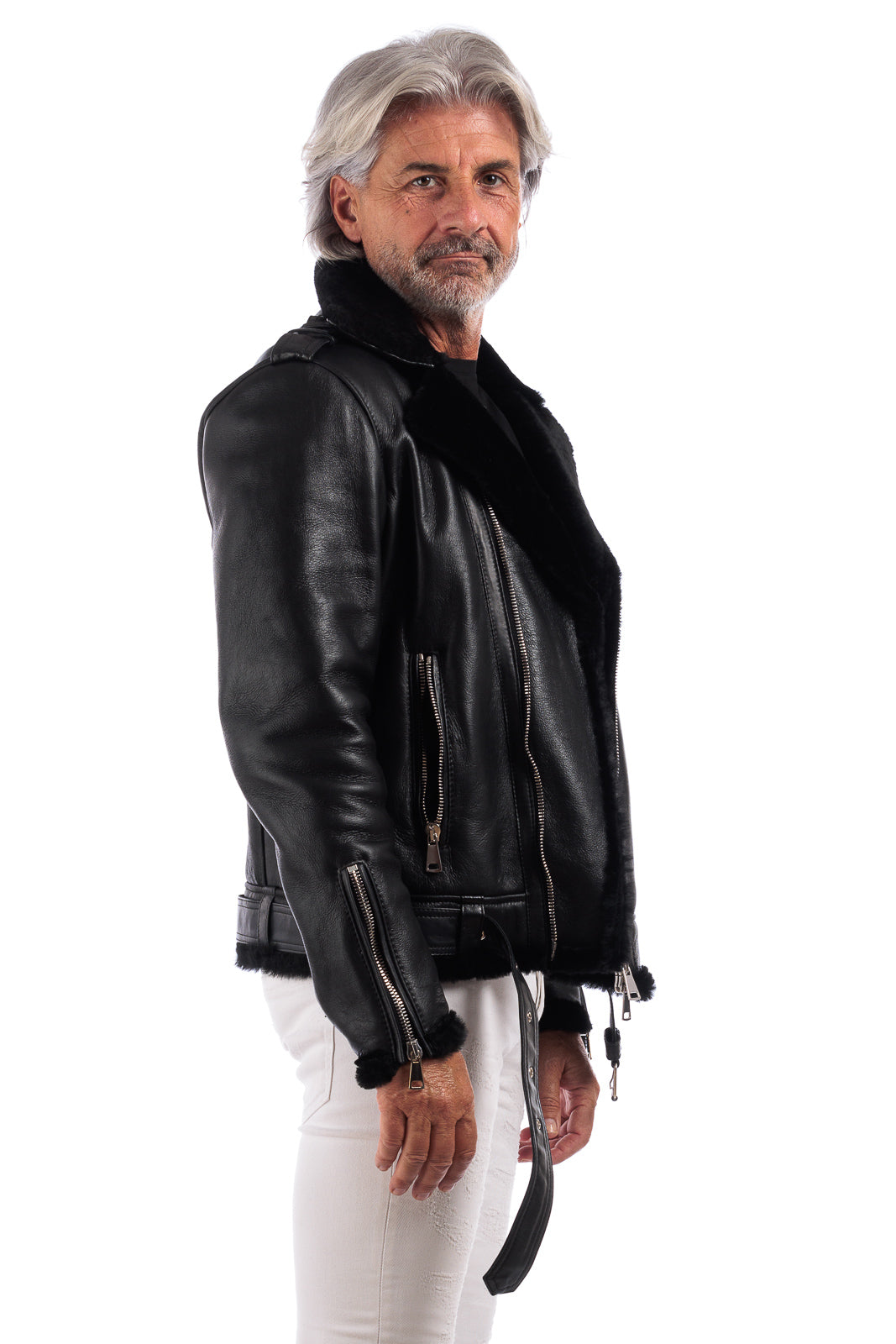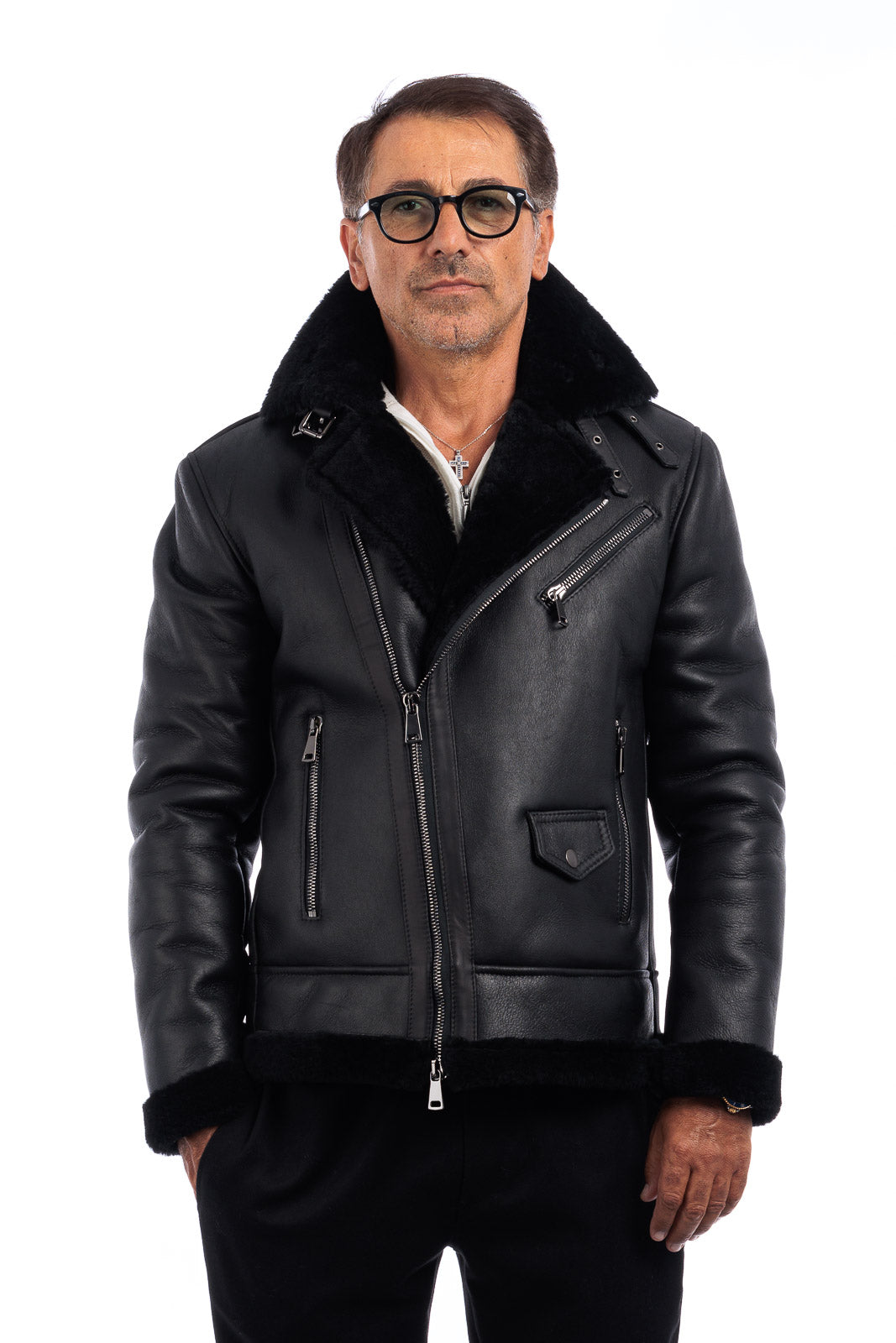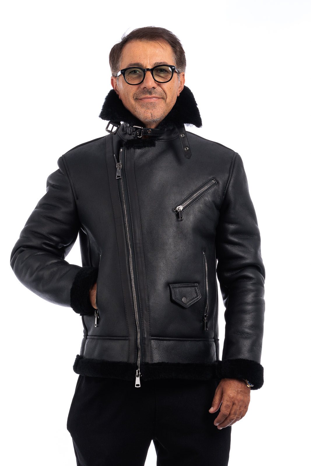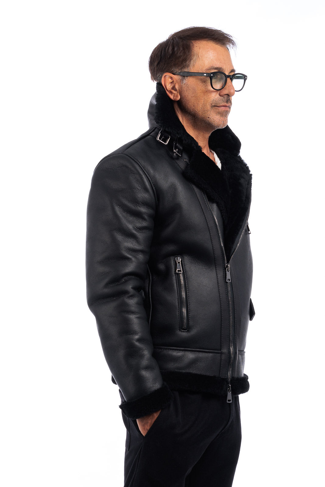 Cappottino in vero montone nero con pelo nero e cappuccio