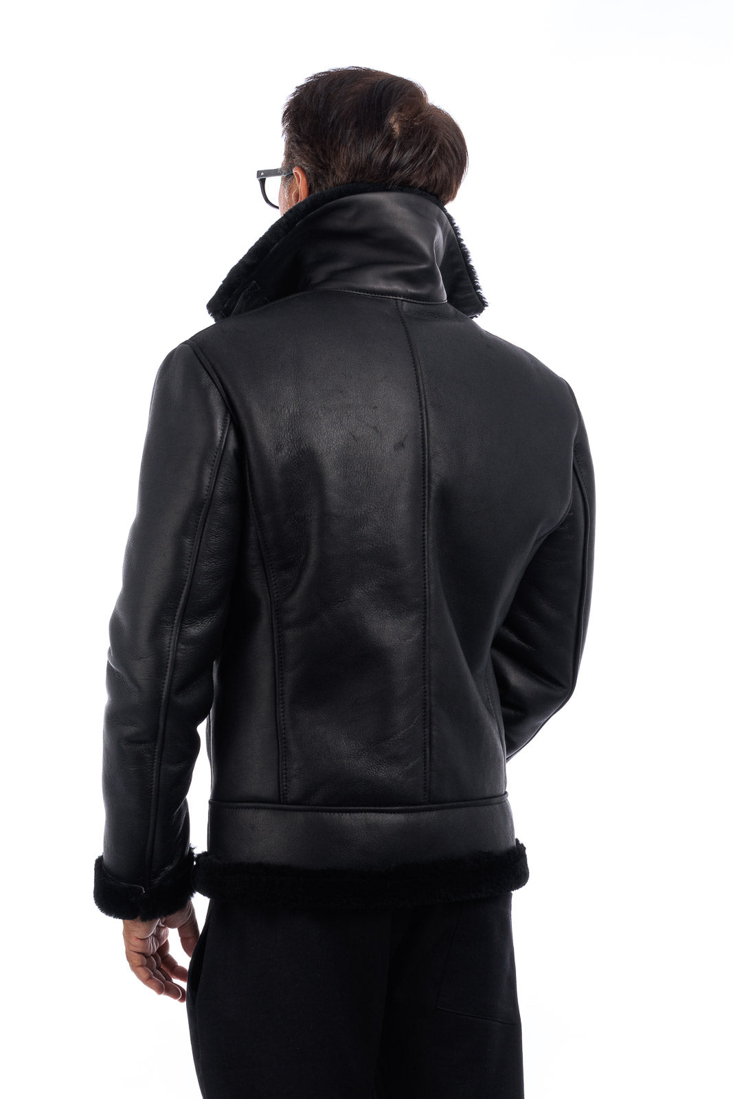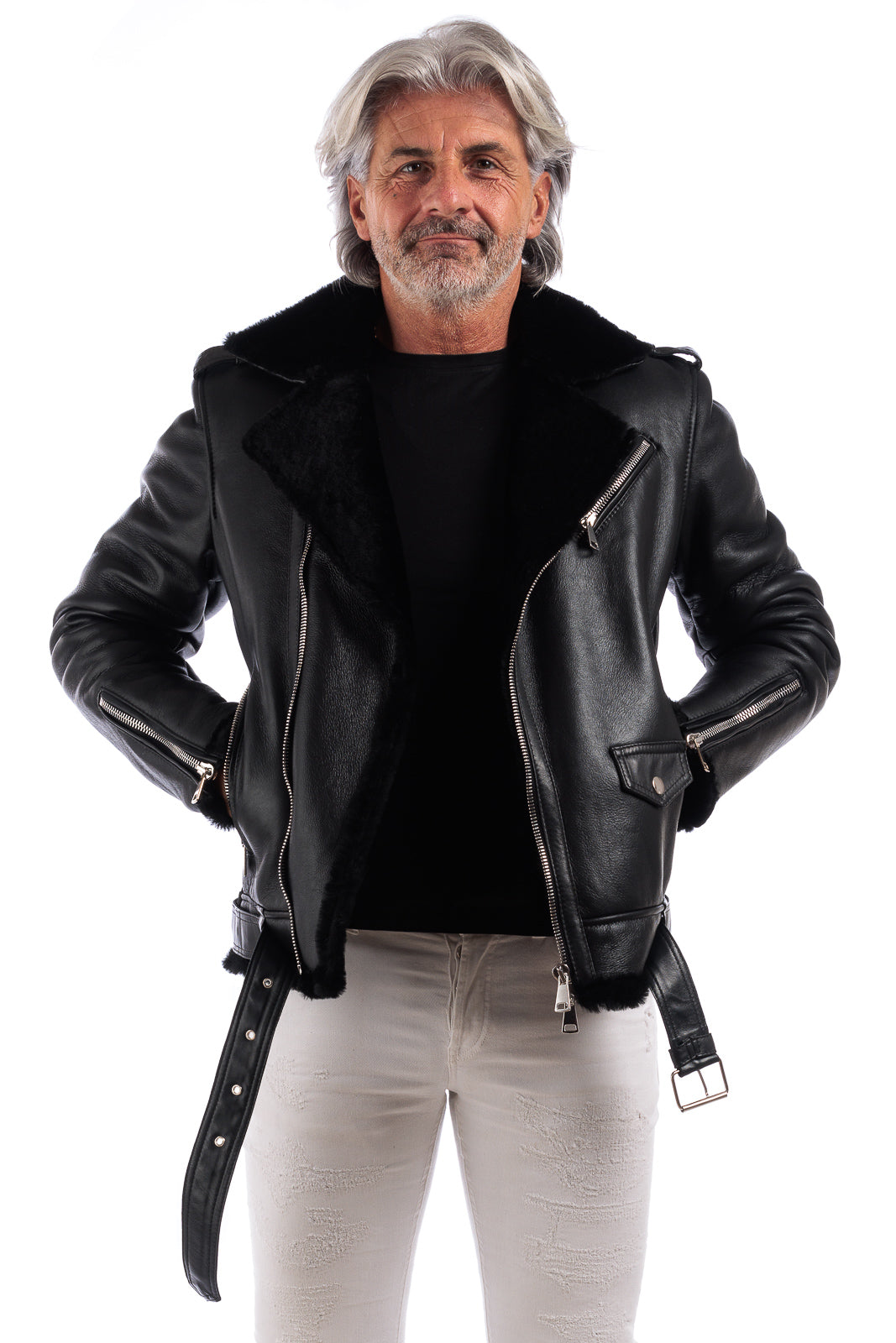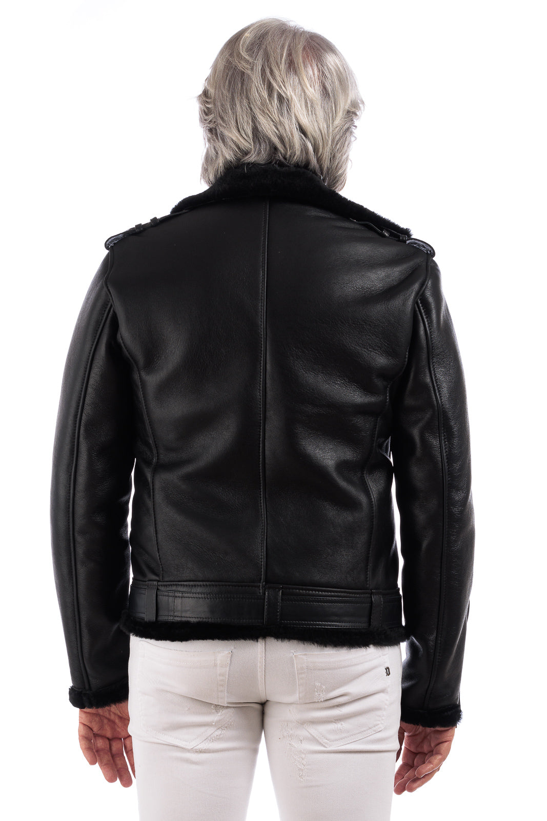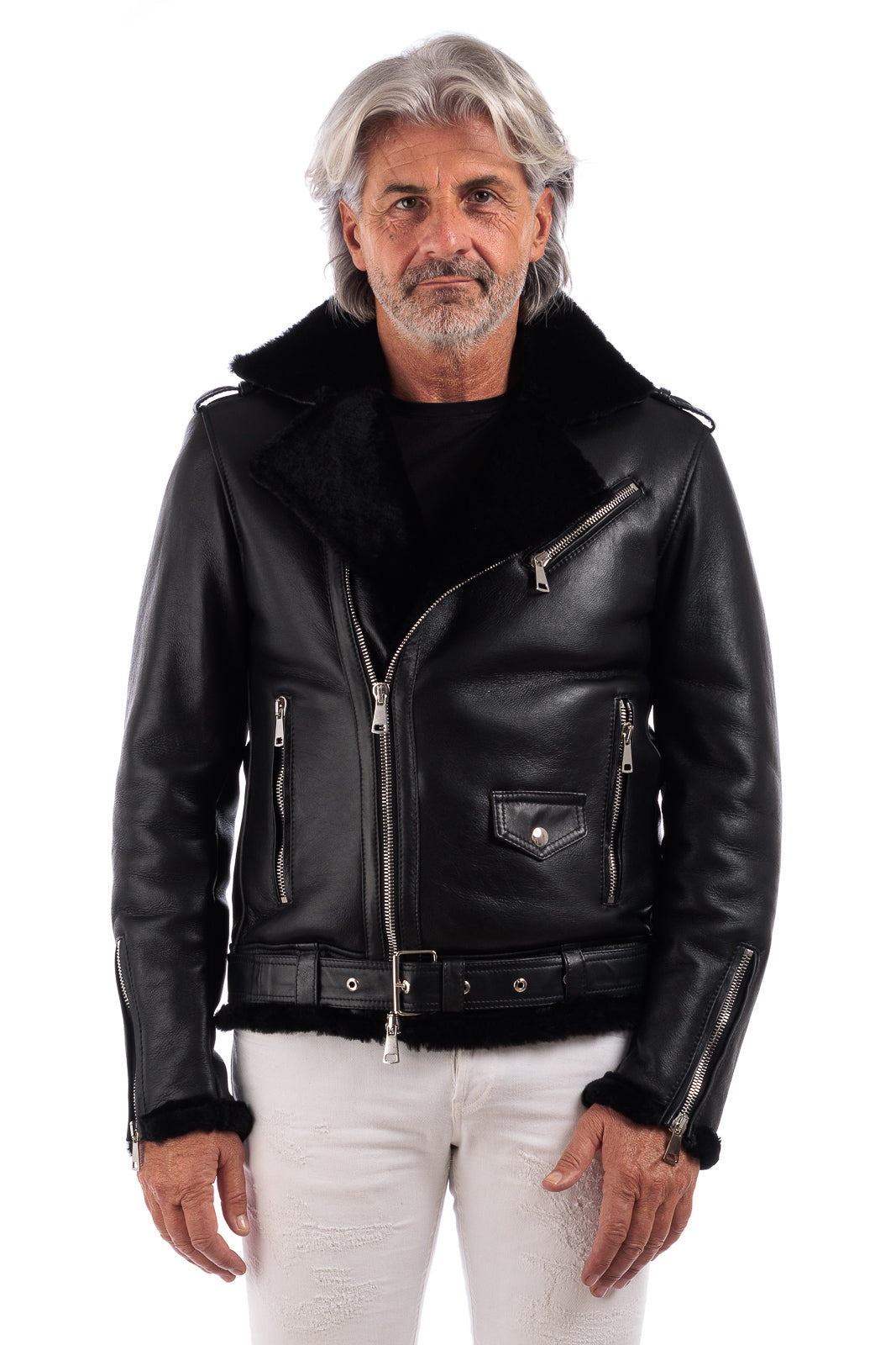 Cappottino in vero montone nero con pelo nero e cappuccio