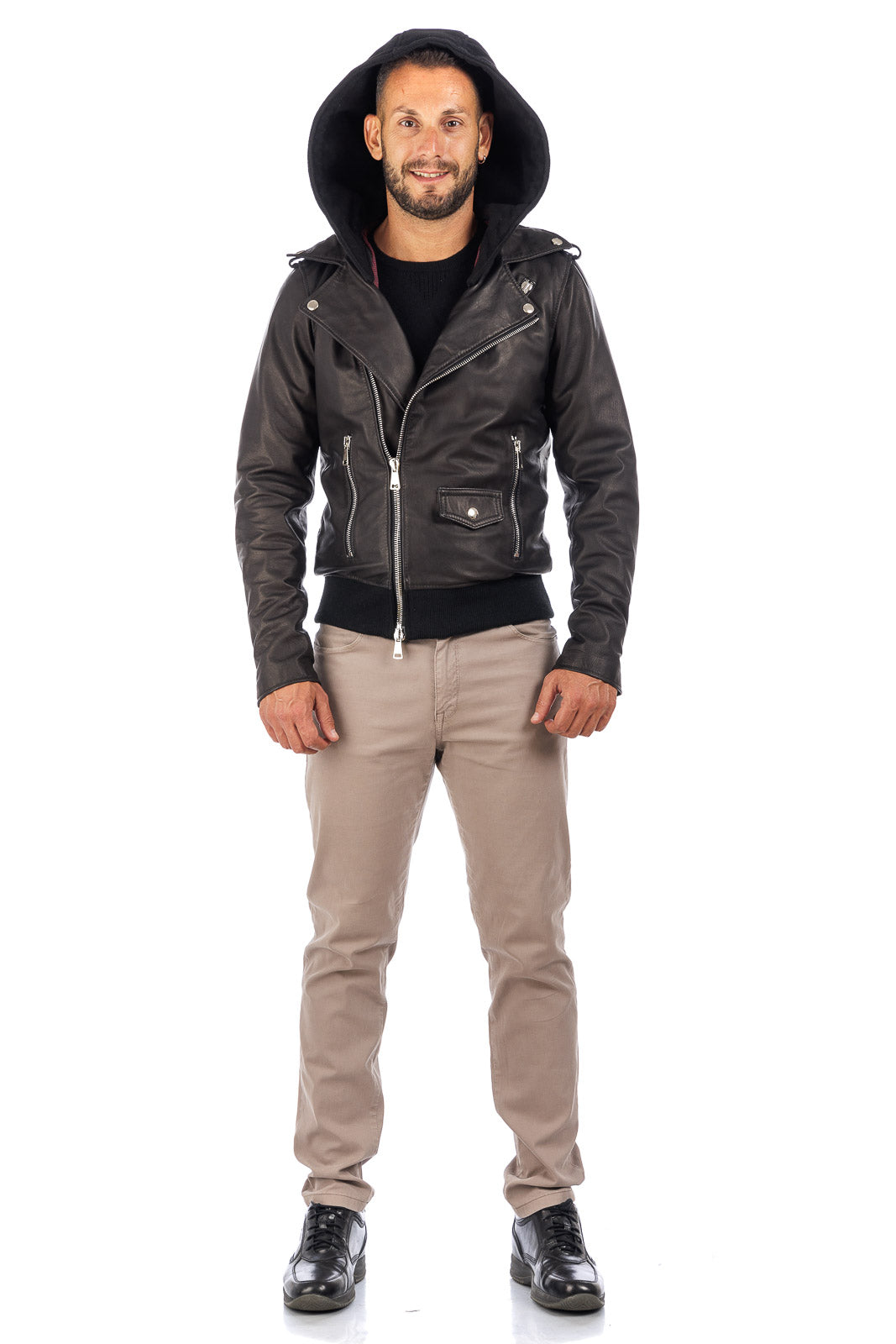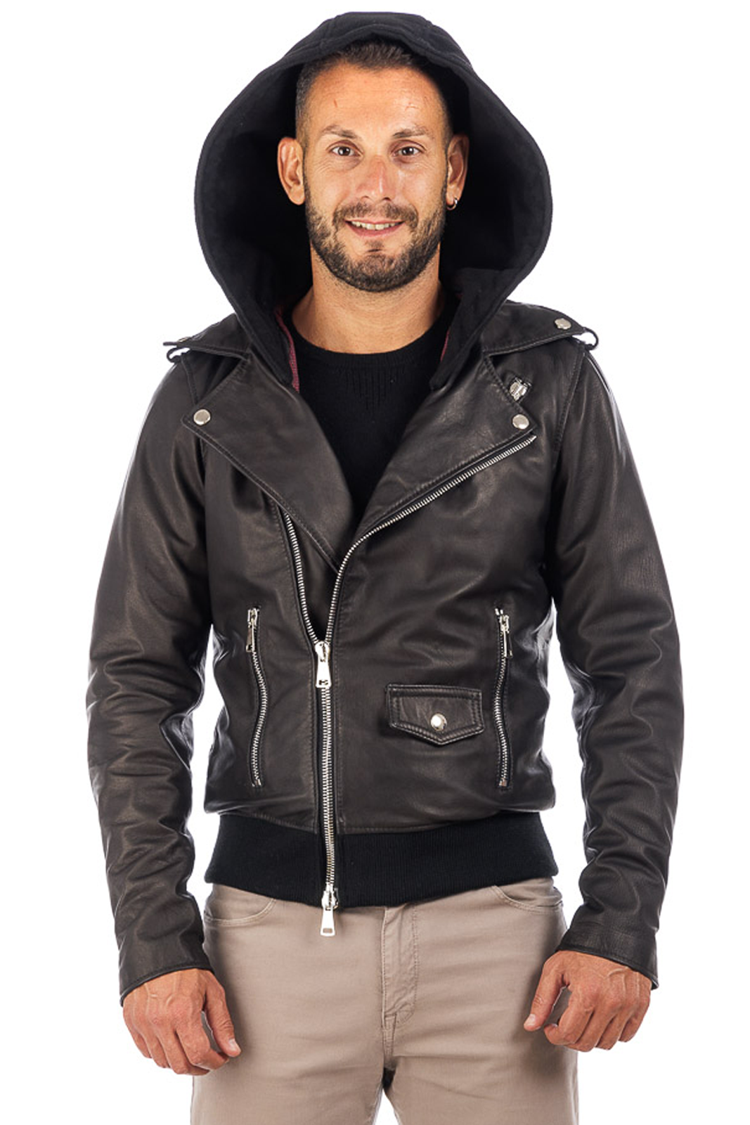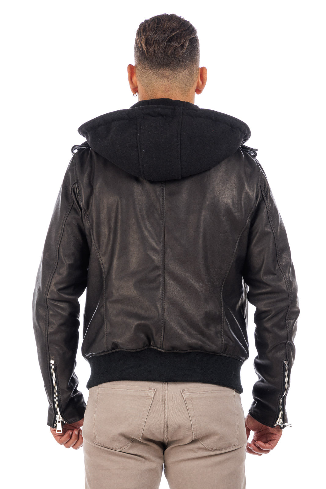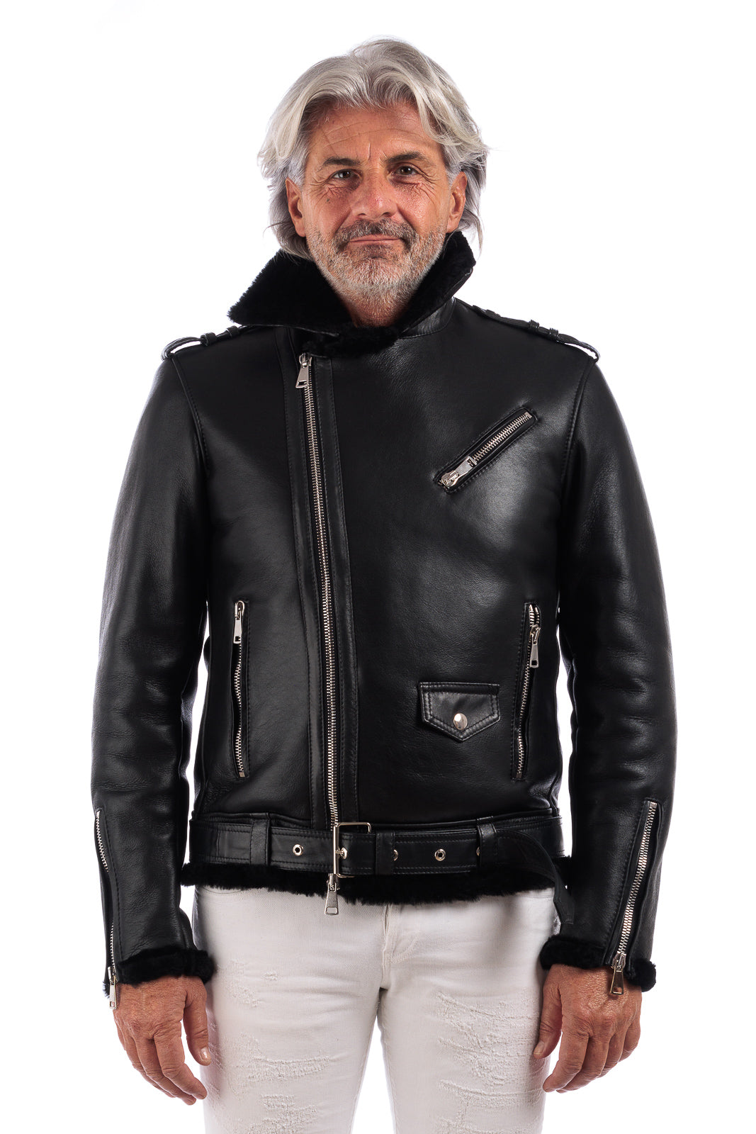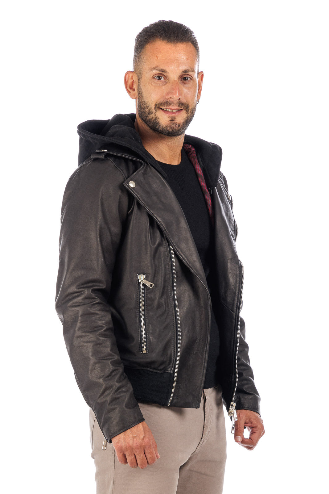 Cappottino in vero montone nero con pelo nero e cappuccio