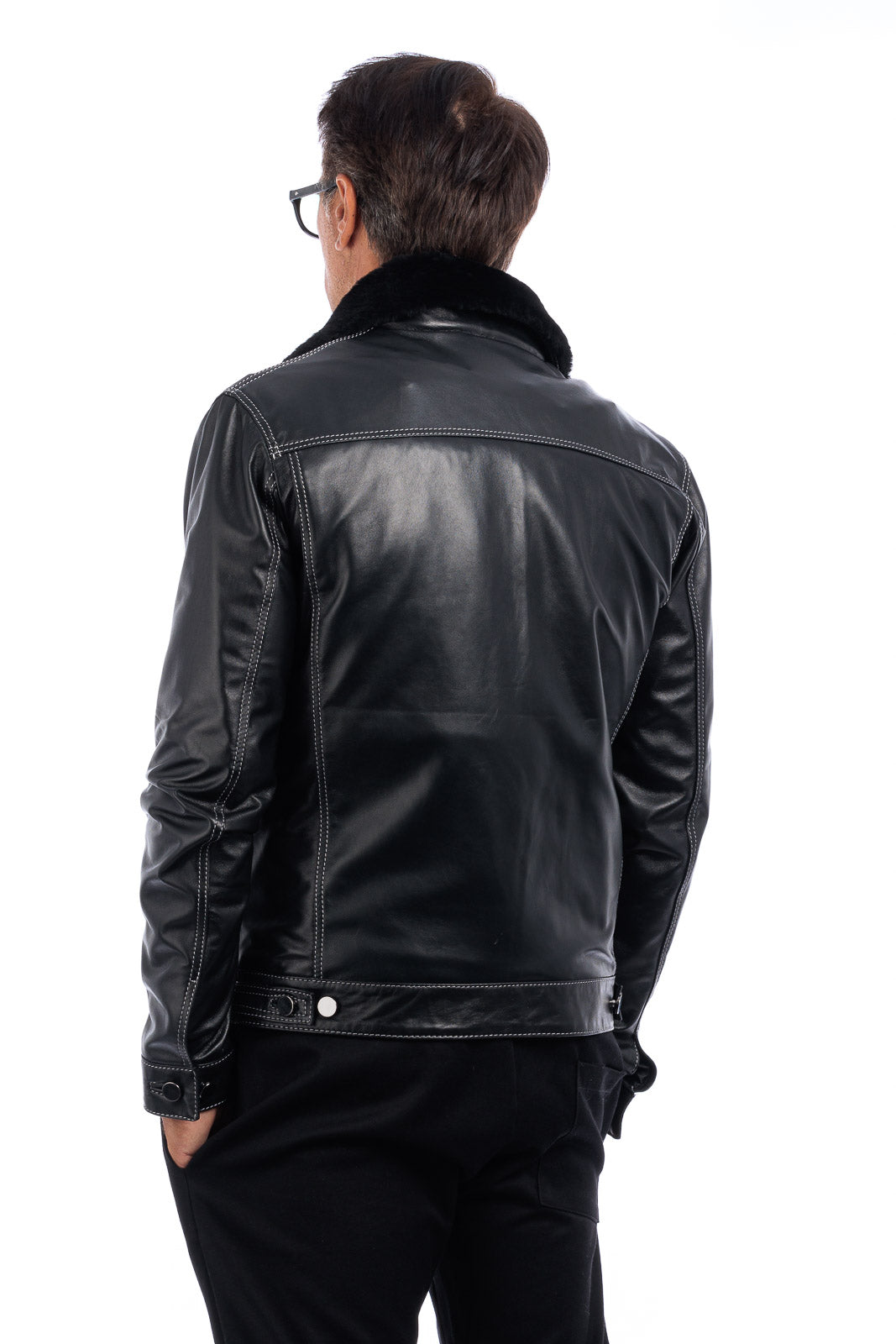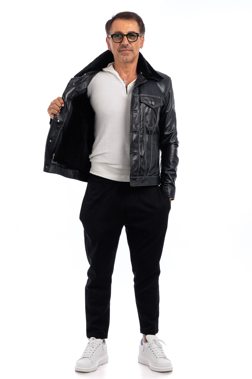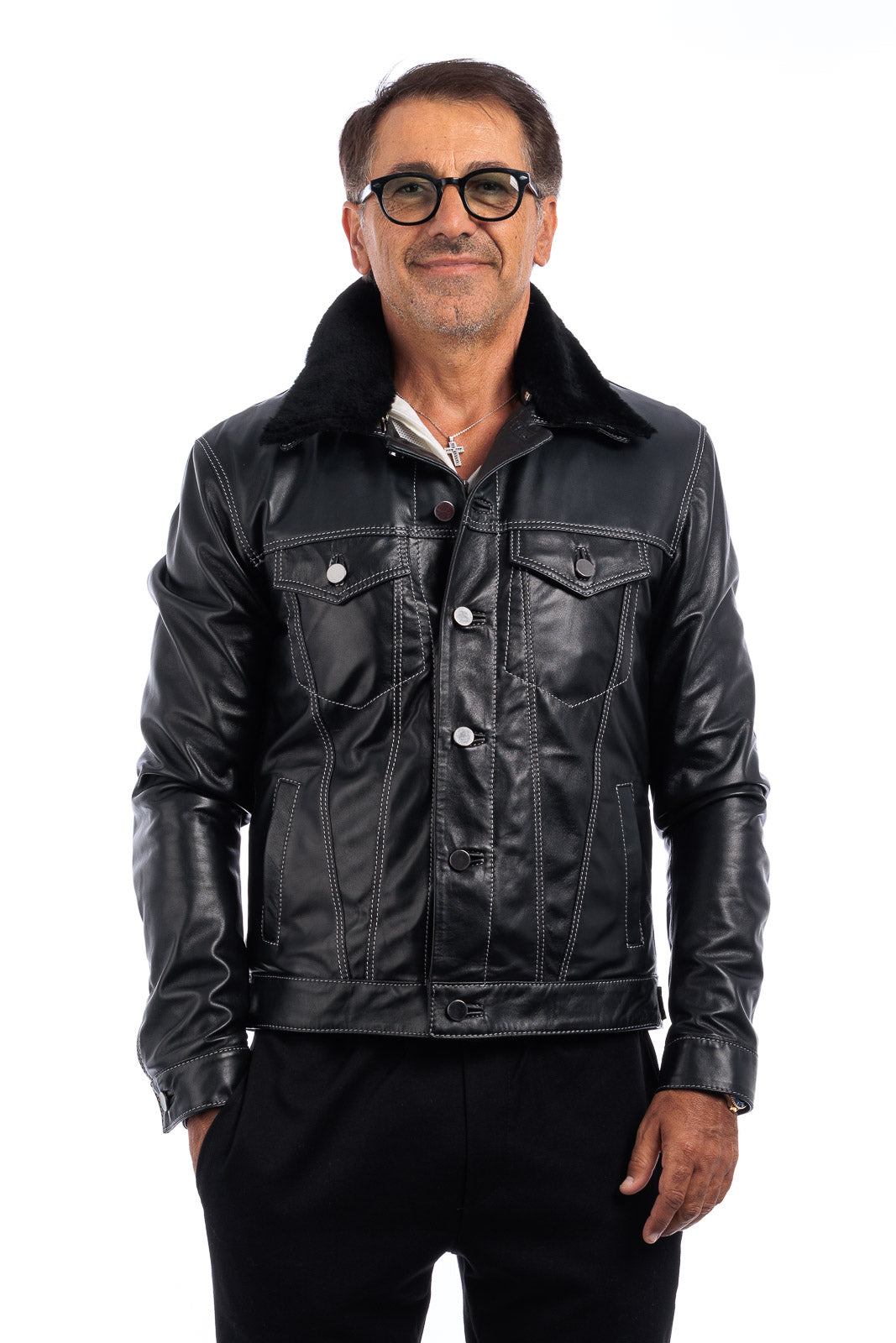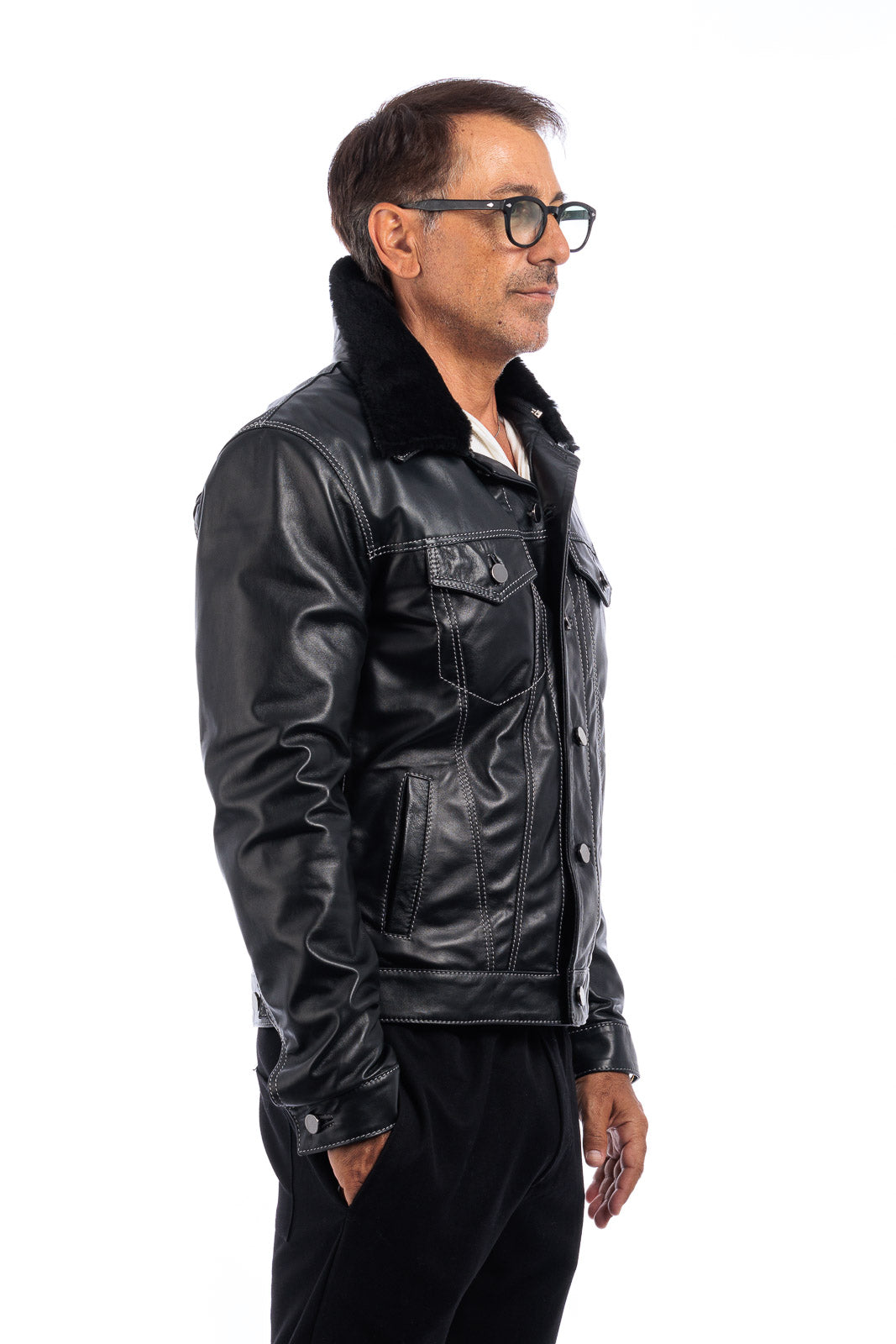 Giacca in pelle nera con collo e gilet staccabile pelo nero JEANS