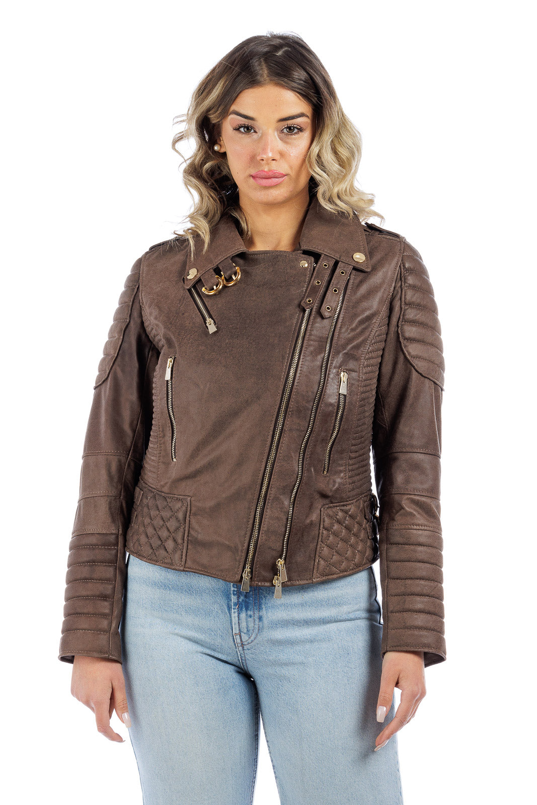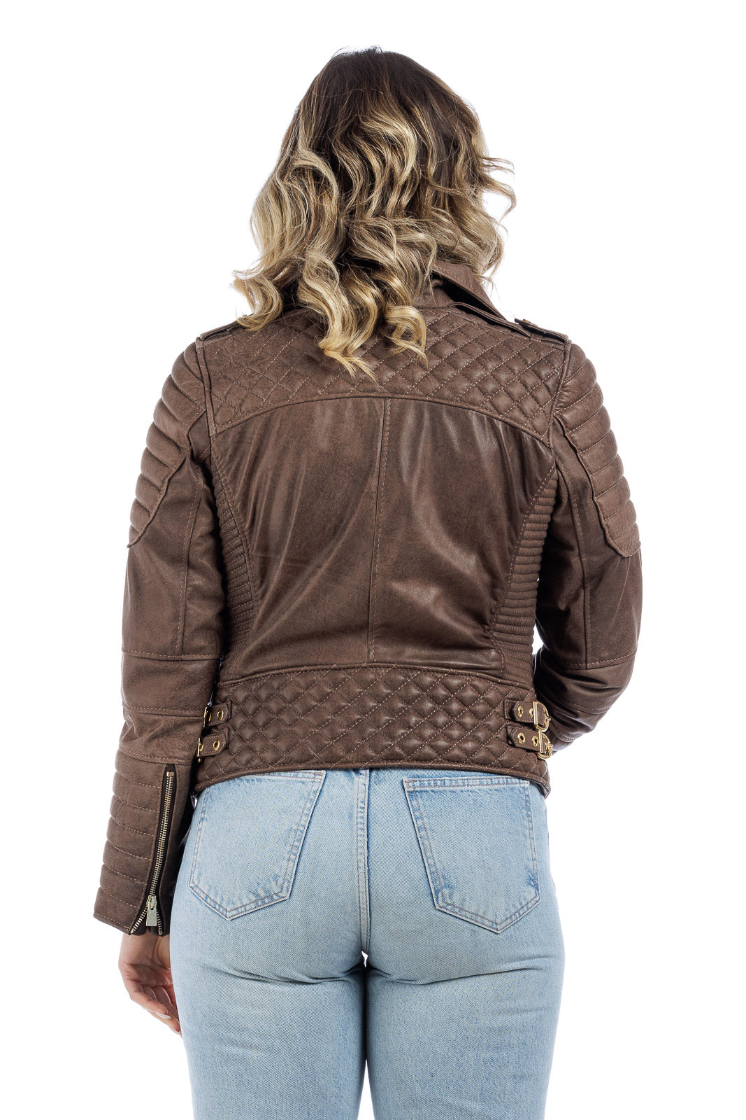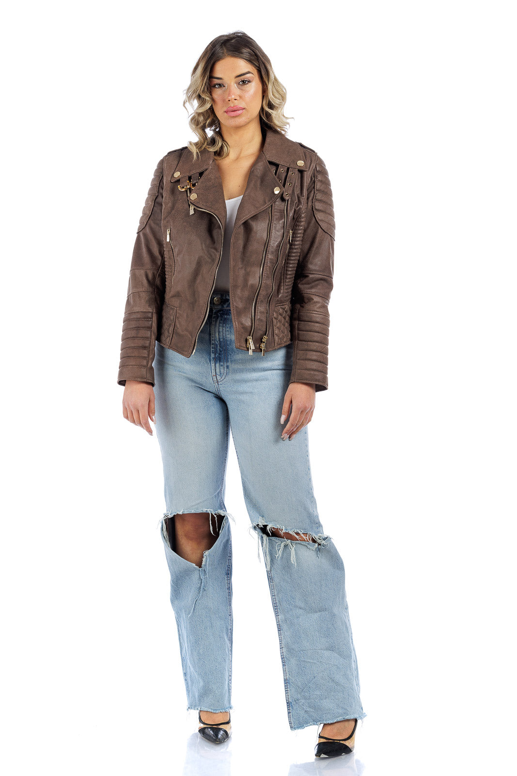 Giacca in pelle donna con zip chiodo 3000 punti a mano marrone