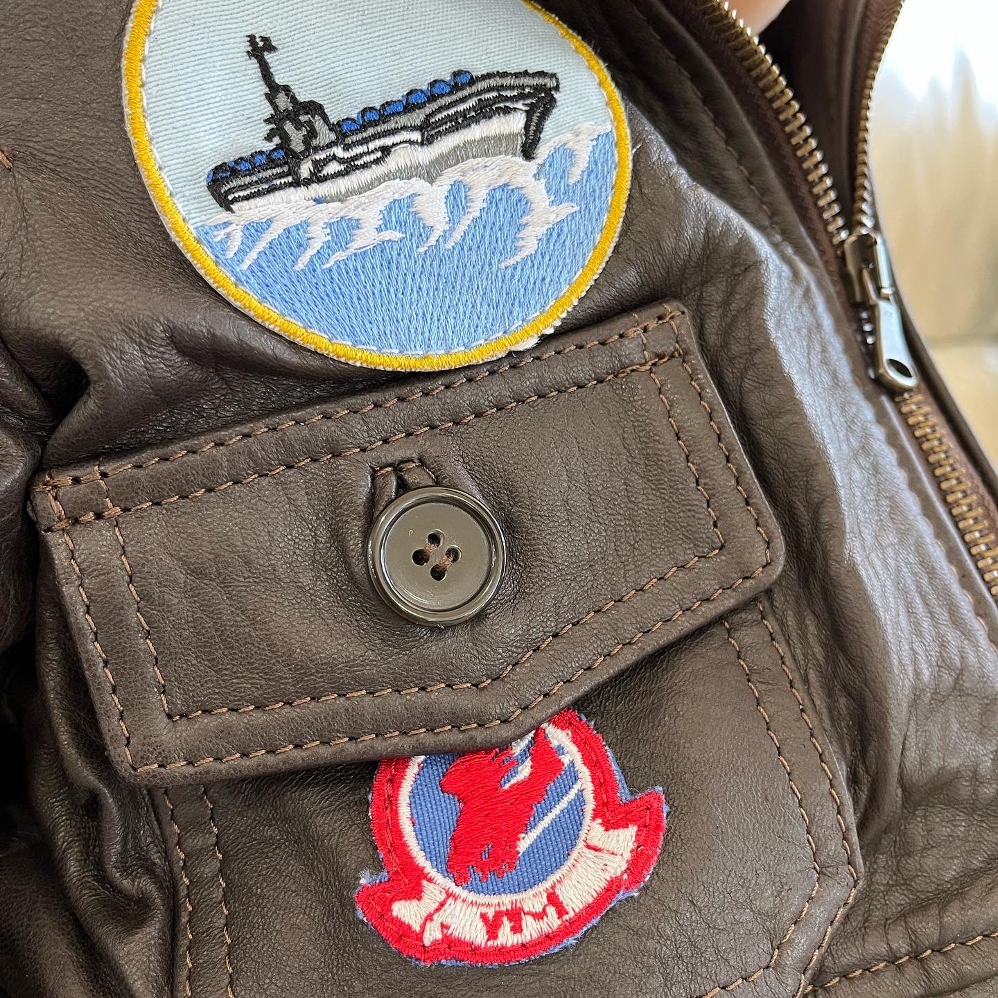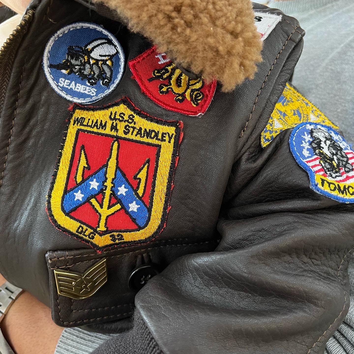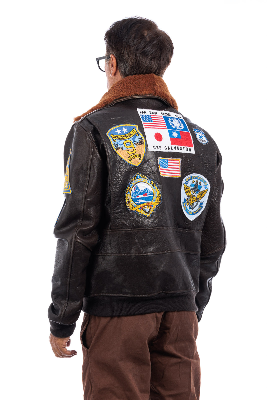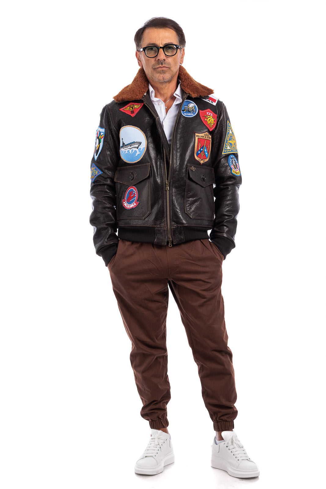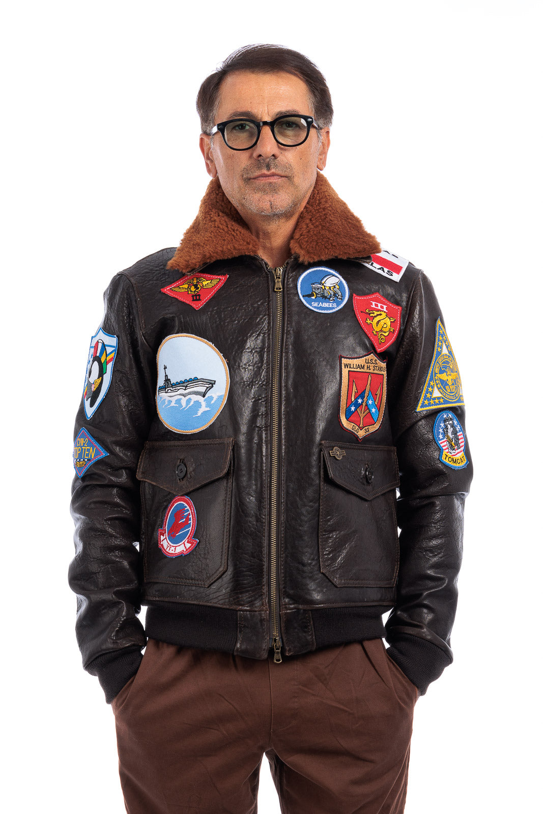 Giacca in vera pelle con zip uomo con toppe e collo in montone TOP GUN