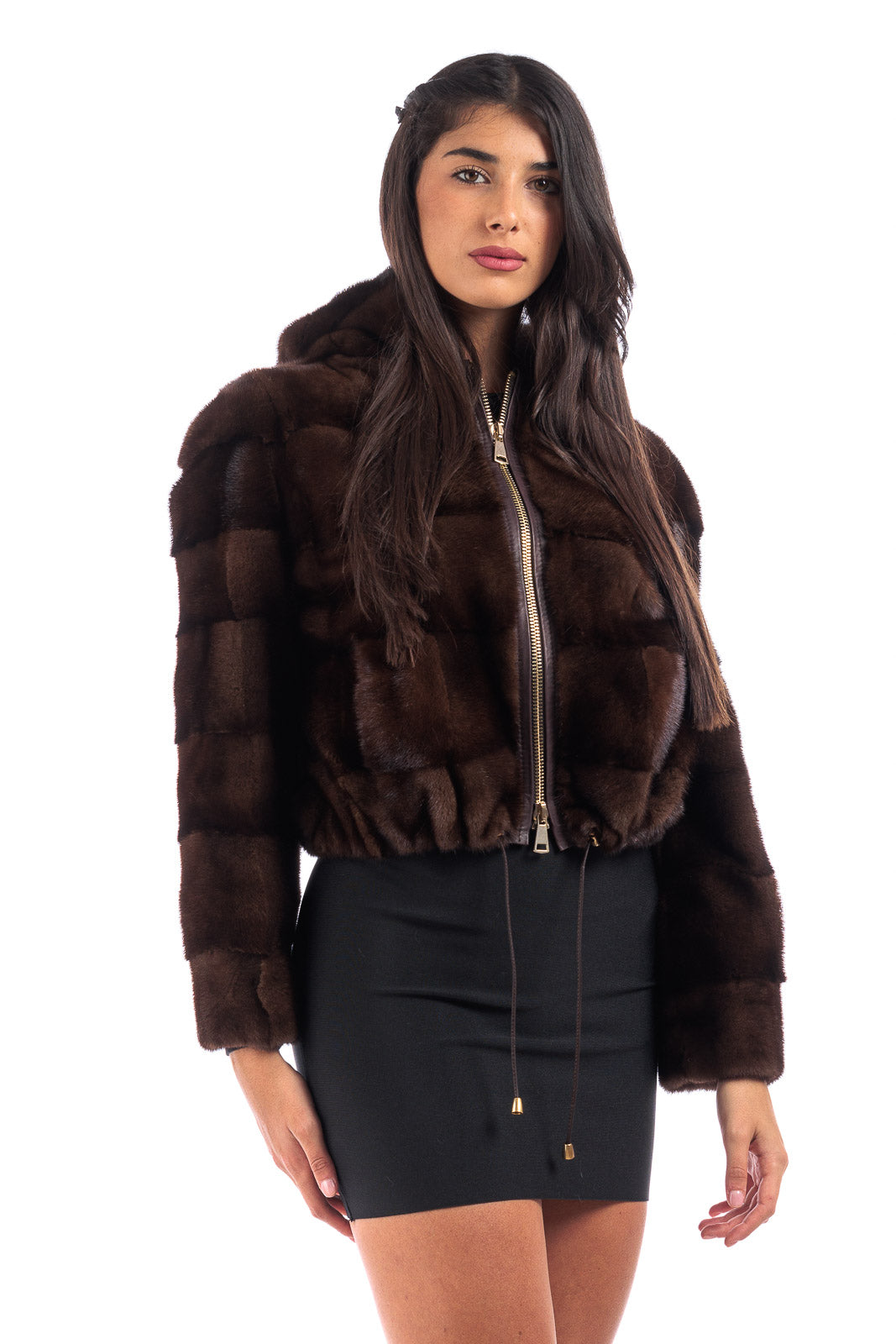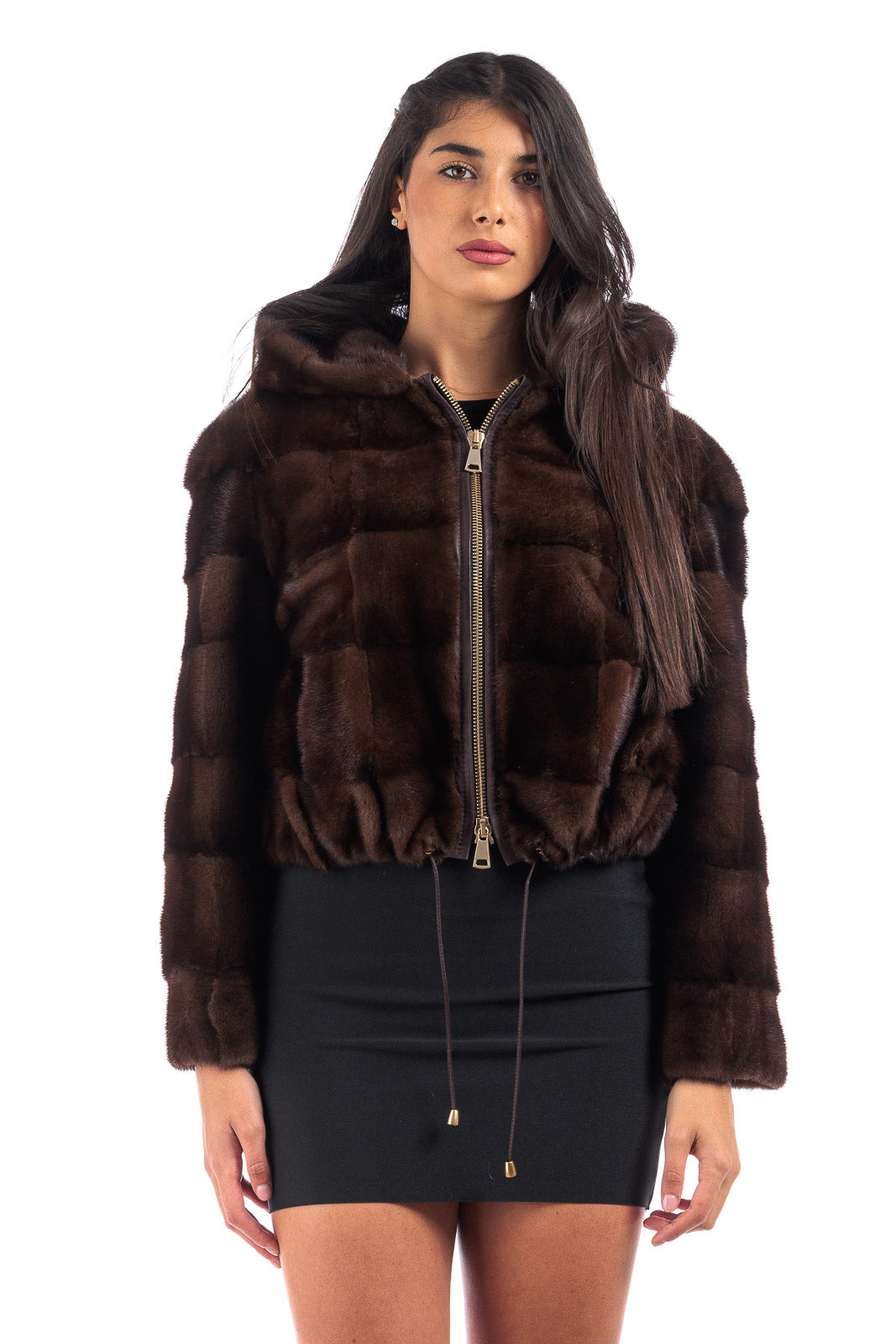 Giacca in pelliccia di Visone demy buff corta con zip e cappuccio