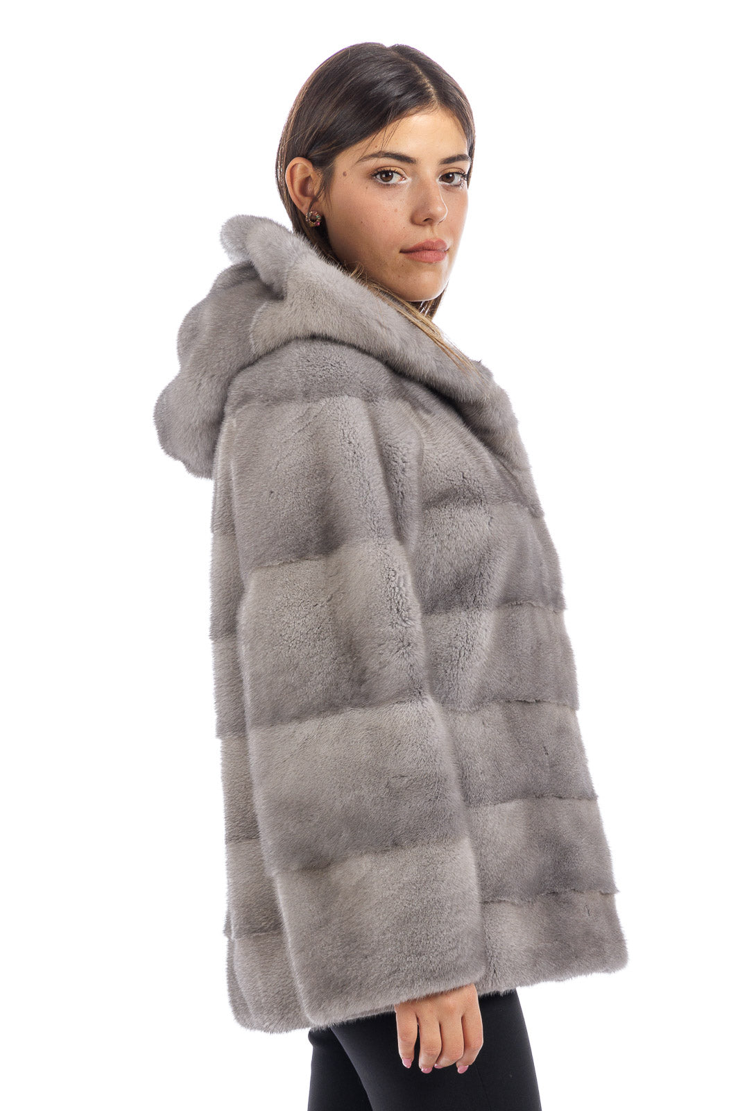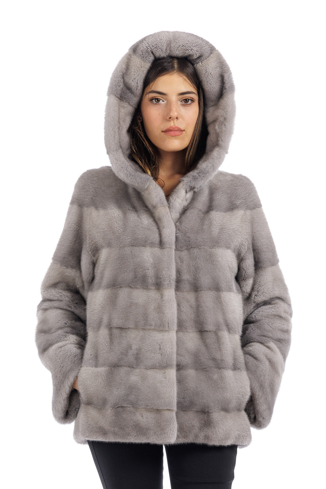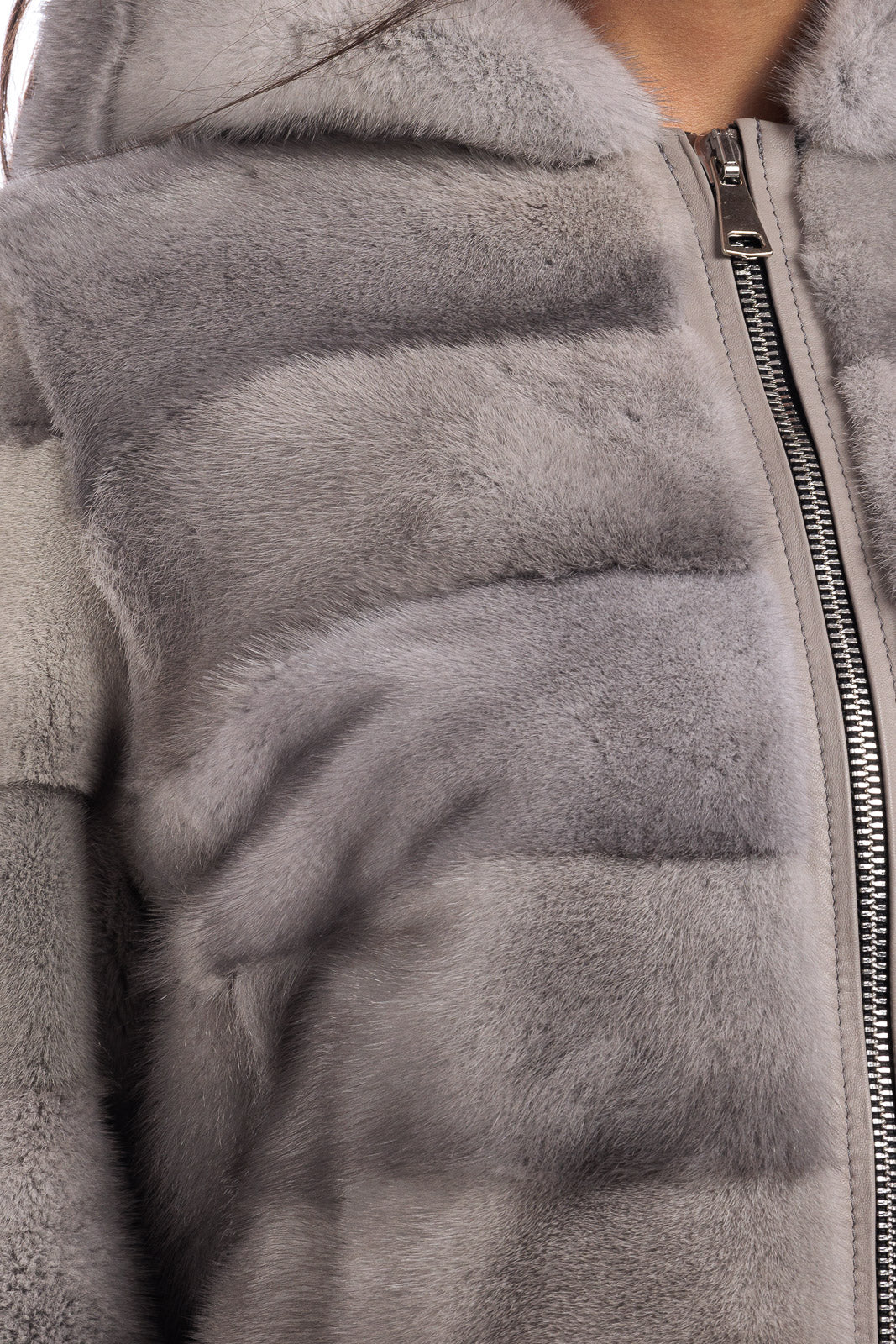 Giacca in pelliccia di Visone sapphire grigio perla con cappuccio
