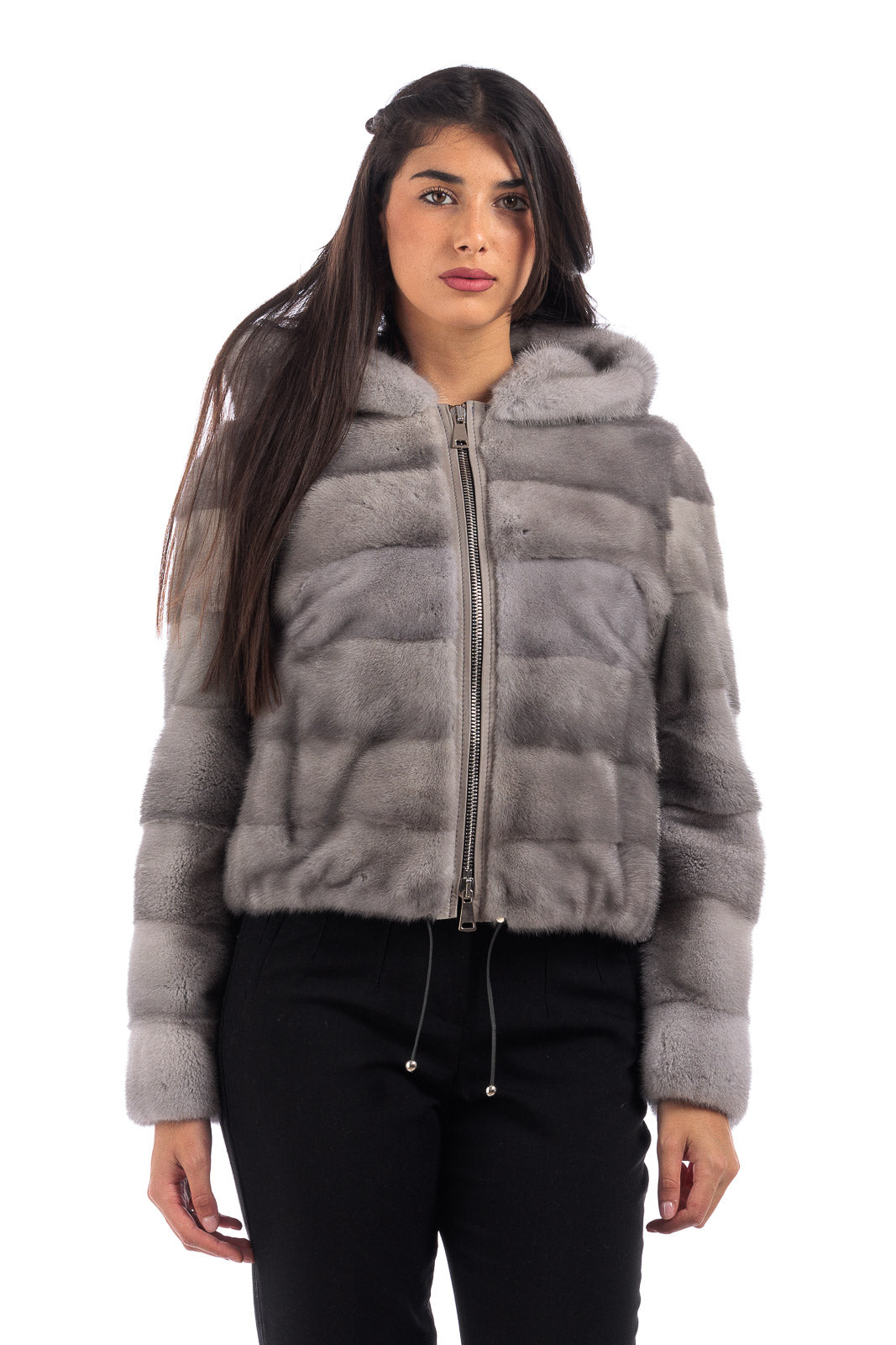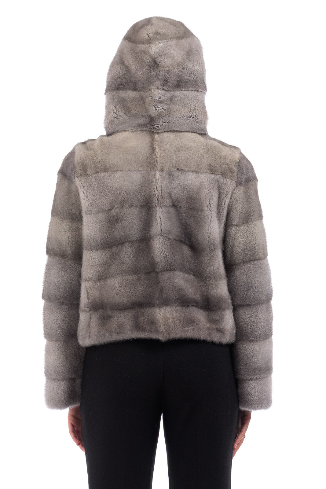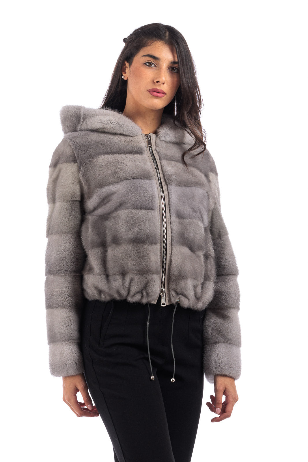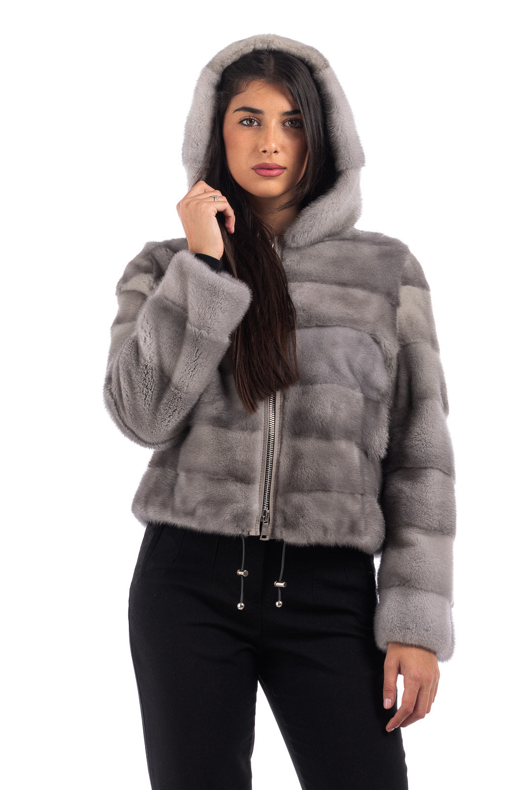 Giacca in pelliccia di Visone sapphire grigio perla corta con cappuccio