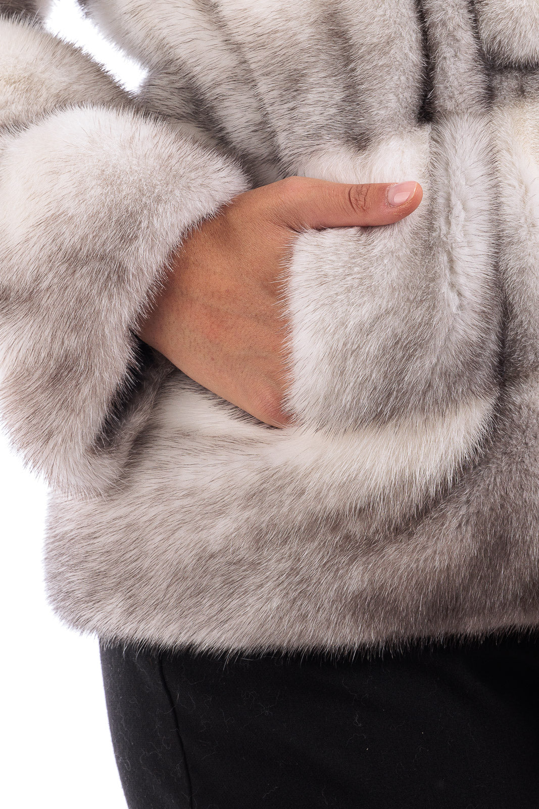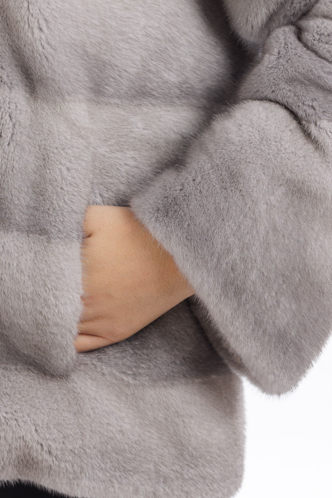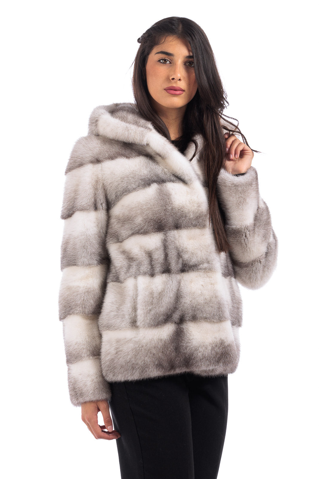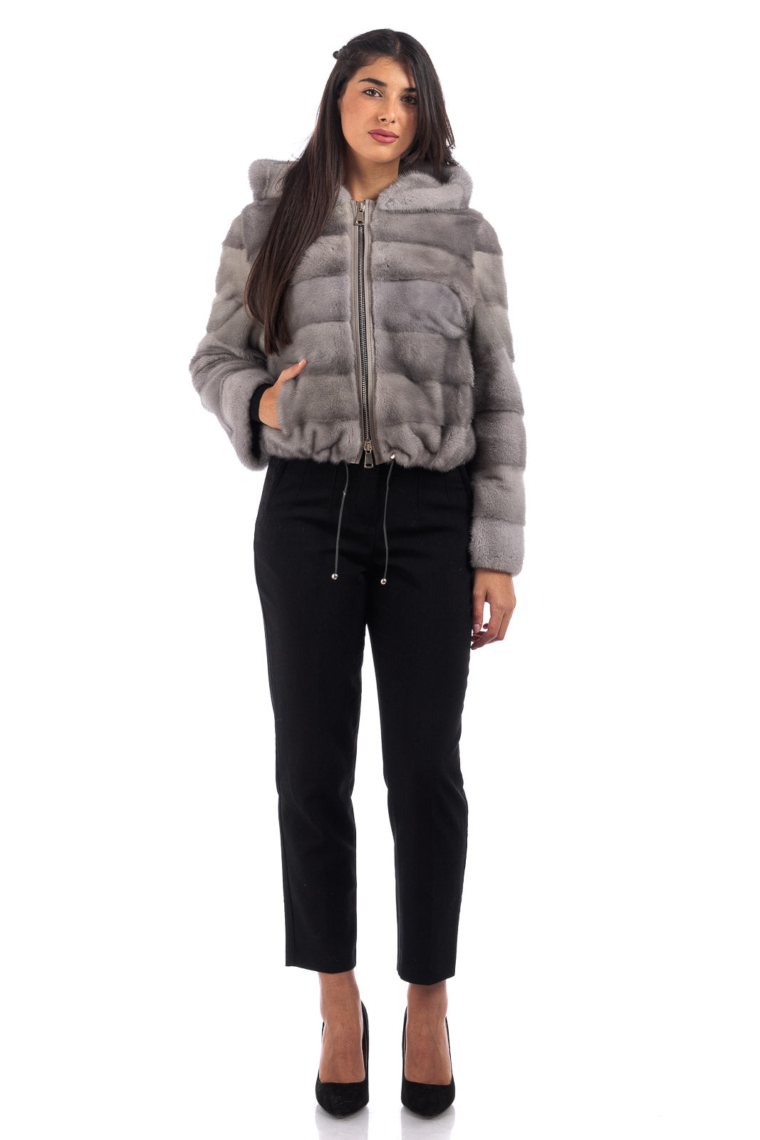 Giacca in pelliccia di Visone sapphire grigio perla corta con cappuccio