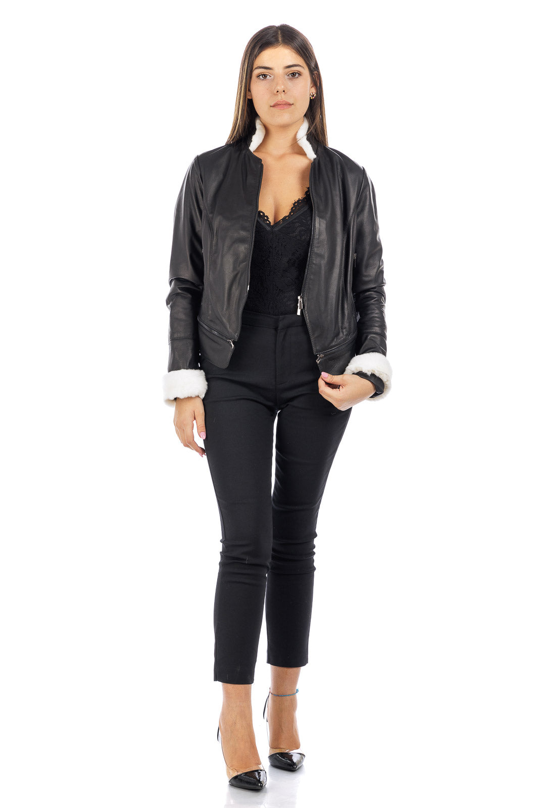 Giacca in vera pelle donna STAK con collo e polso in rex bianco