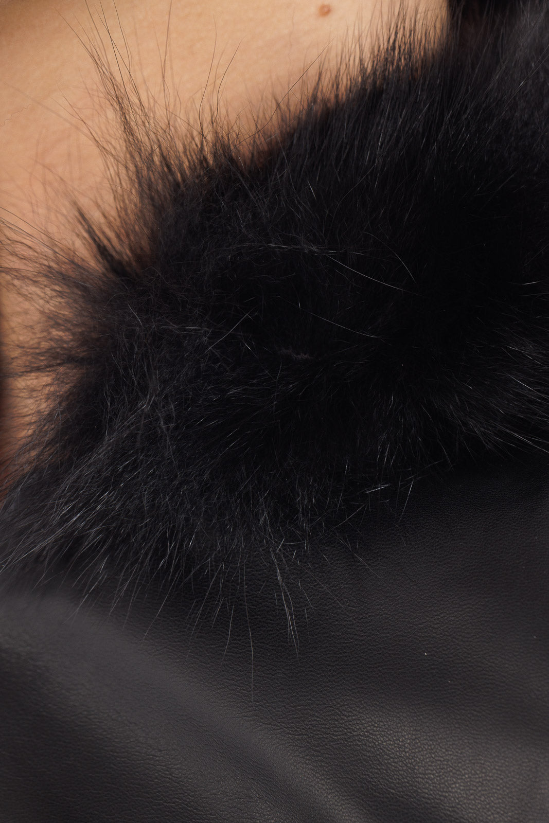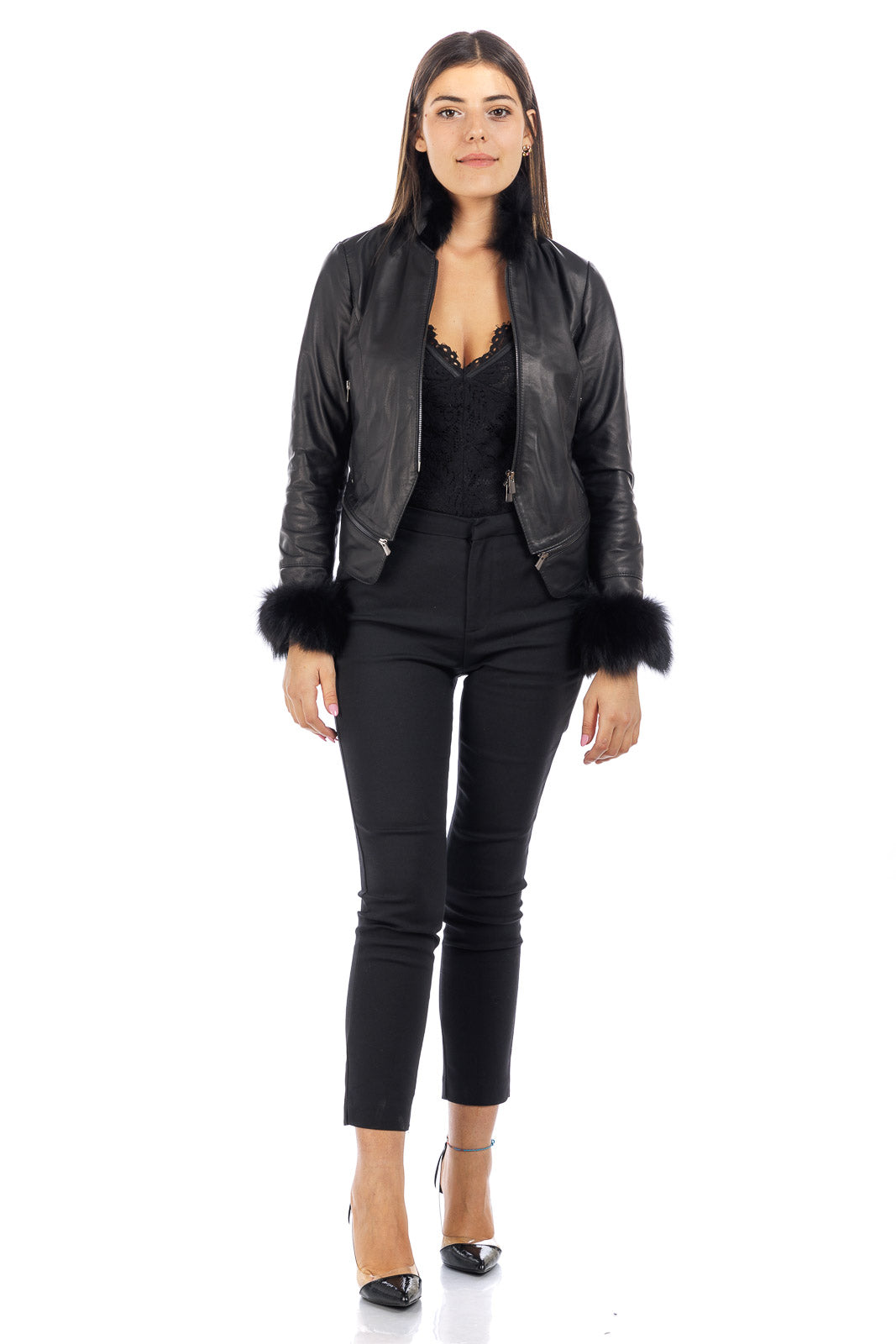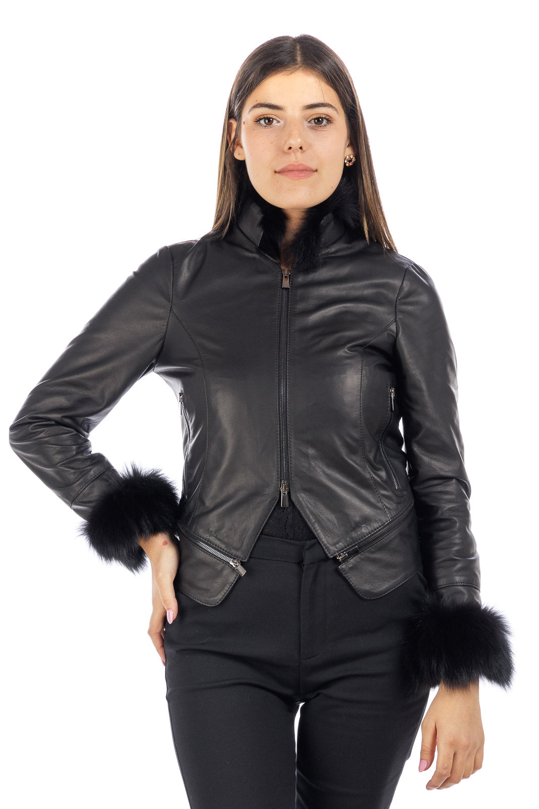 Giacca in vera pelle donna STAK con collo e polso in volpe nera